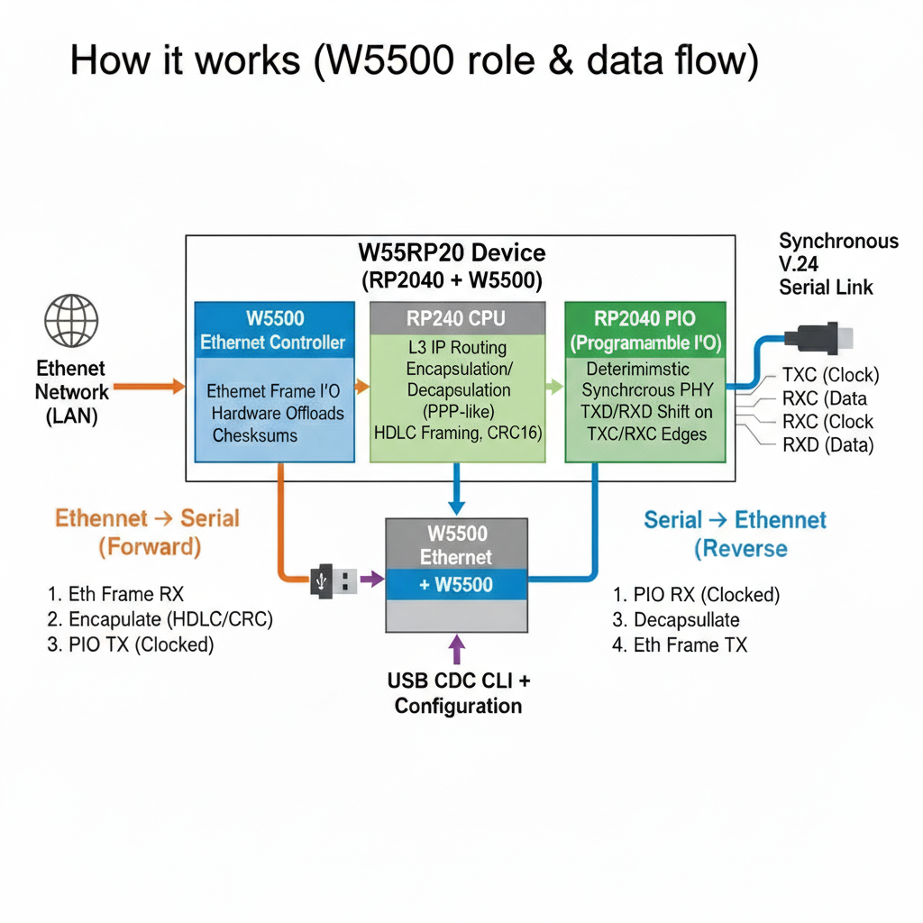 A W55RP20-based (RP2040 + W5500) device that performs L3 IP routing between Ethernet and a synchronous V.24 serial link using PPP-like encapsulation and HDLC+CRC.