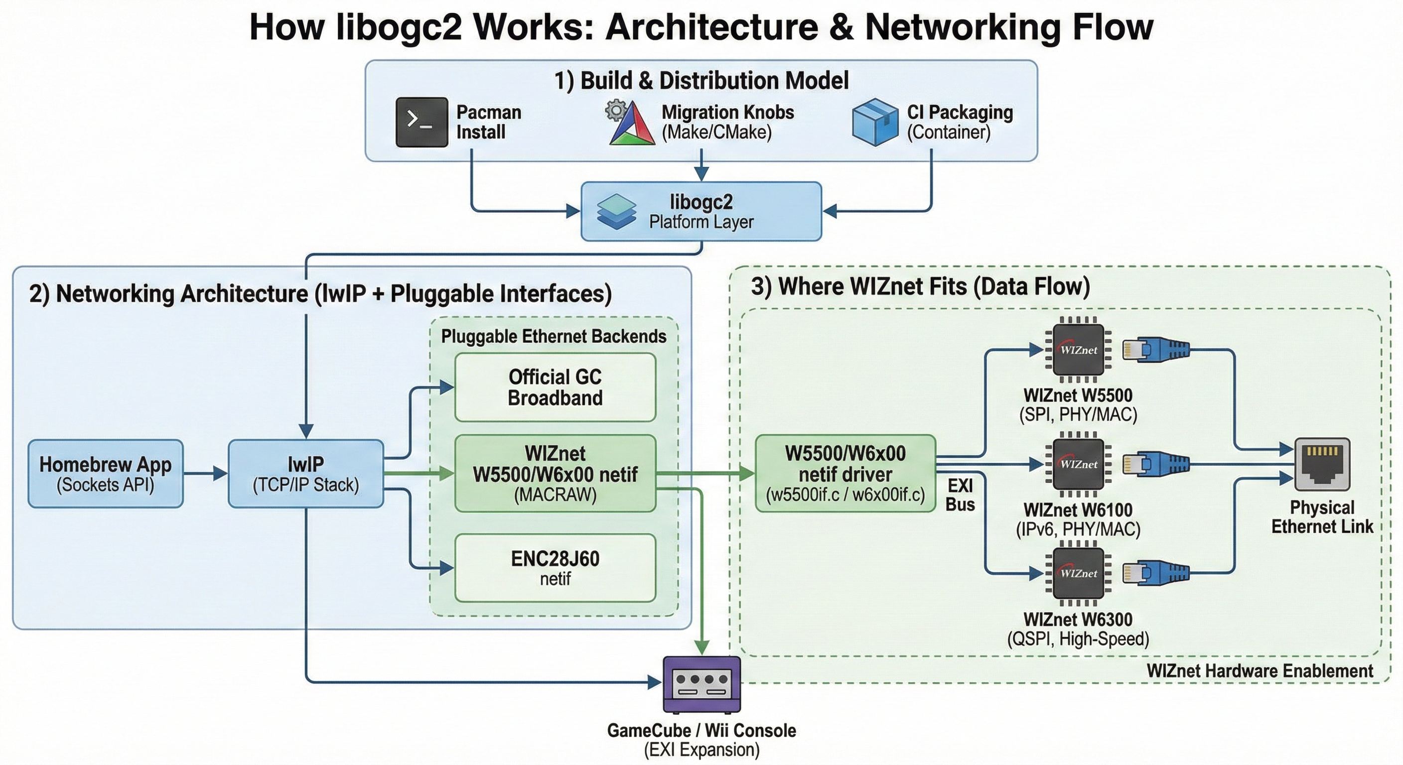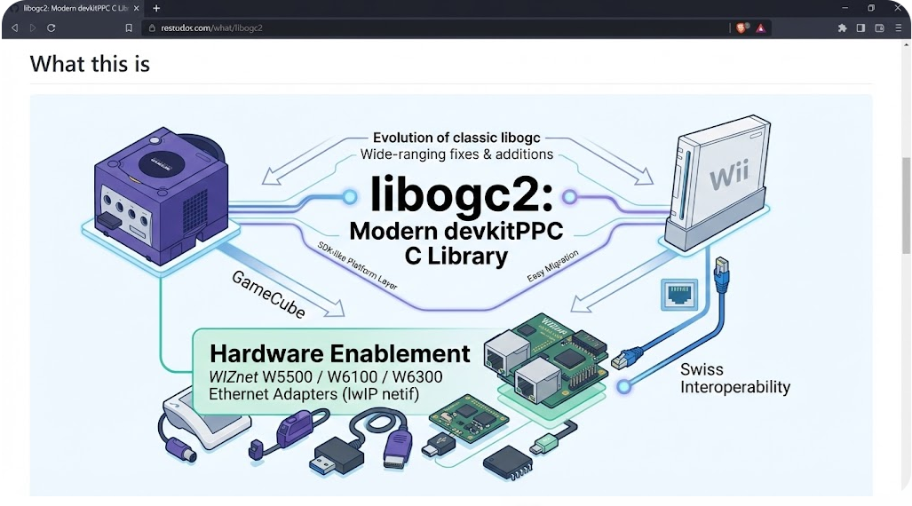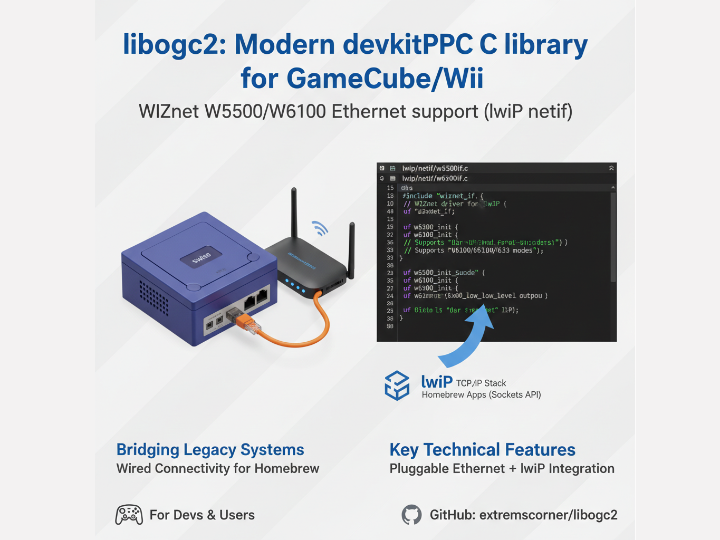 libogc2 by Extrems’ Corner modernizes the GameCube/Wii homebrew SDK, adding lwIP networking and EXI Ethernet support for WIZnet W5500 and W6100/W6300 adapters.