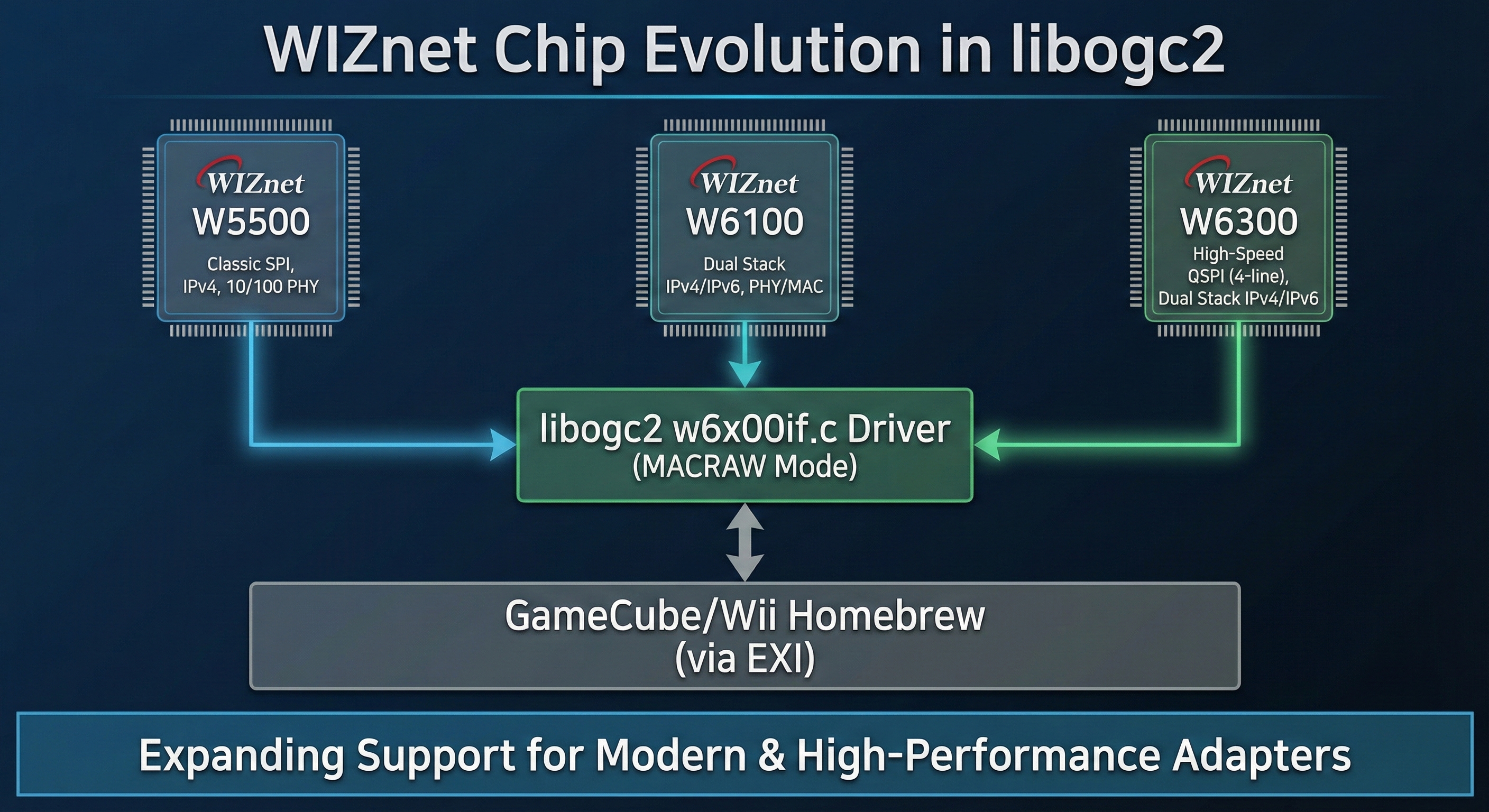 - WIZnet adapter behavior depends on hardware: libogc2 provides the netif/EXI recognition and driver hooks, but real-world performance and stability also depend on the specific EXI adapter design (clocking, buffering, IRQ wiring).
