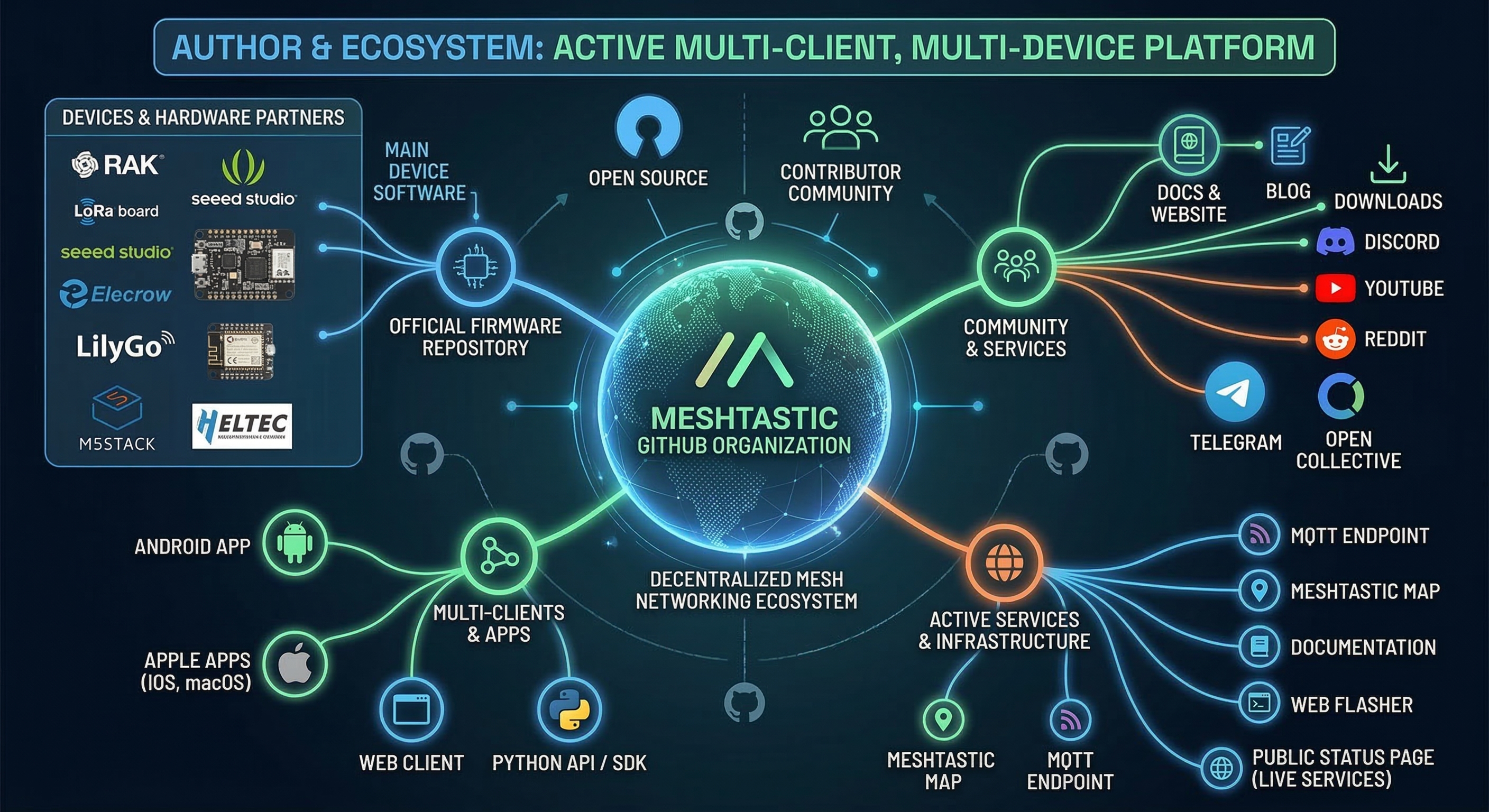 The official site reinforces that ecosystem view. It links Docs, Blog, Downloads, Discord, YouTube, Reddit, Telegram, and Open Collective, and it lists multiple hardware supporters such as RAK Wireless, Seeed Studio, Elecrow, LilyGo, M5Stack, and Heltec. It also runs public-facing online services including the web client, map, MQTT endpoint, documentation, and a public status page. That is important curator context: Meshtastic firmware sits inside an actively maintained multi-client, multi-device ecosystem rather than standing alone as “just firmware.” (Meshtastic)
