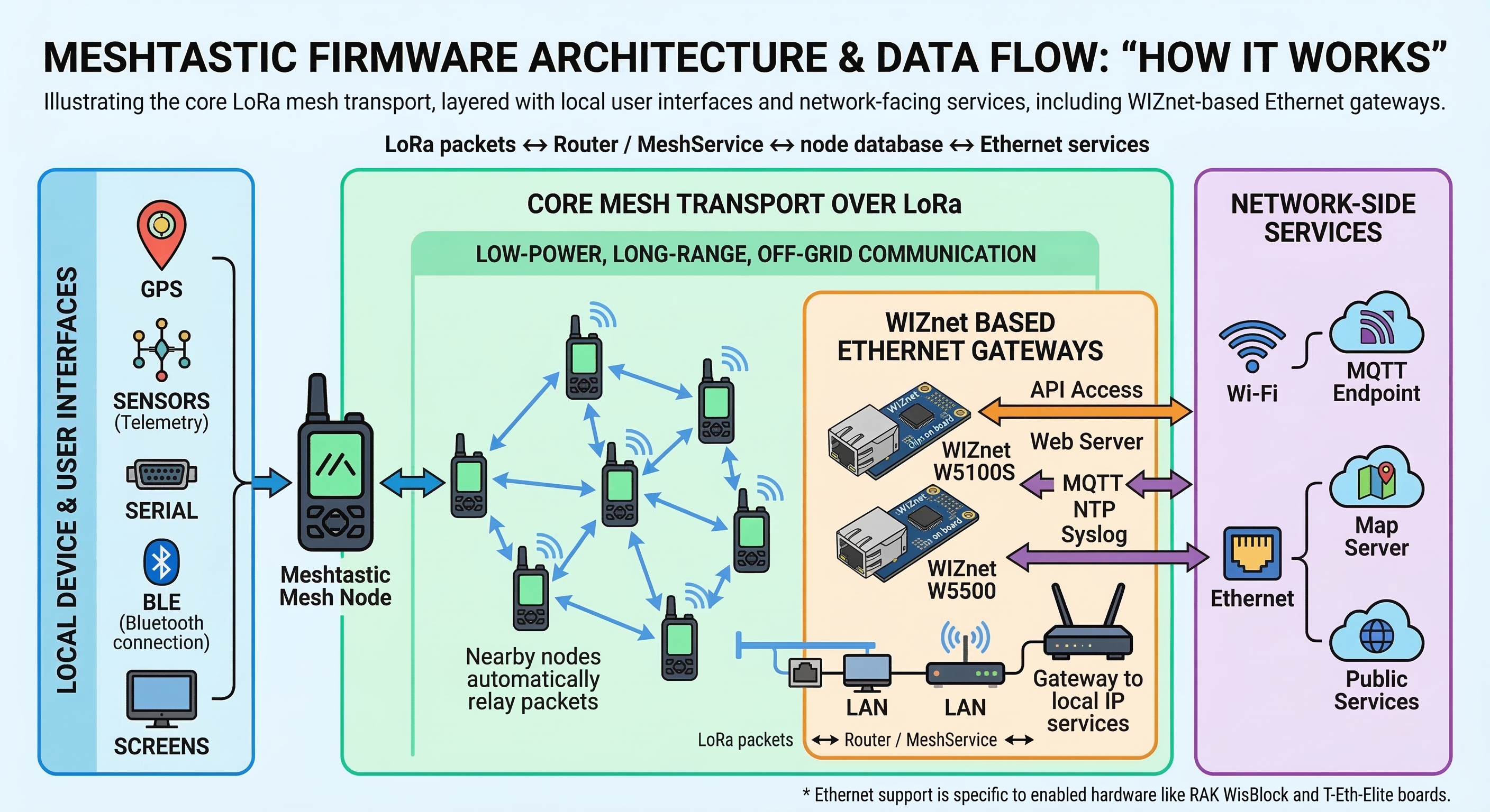 Meshtastic firmware powers off-grid LoRa mesh devices, while selected WIZnet-enabled boards add Ethernet services for API, time sync, and gateway-style roles.