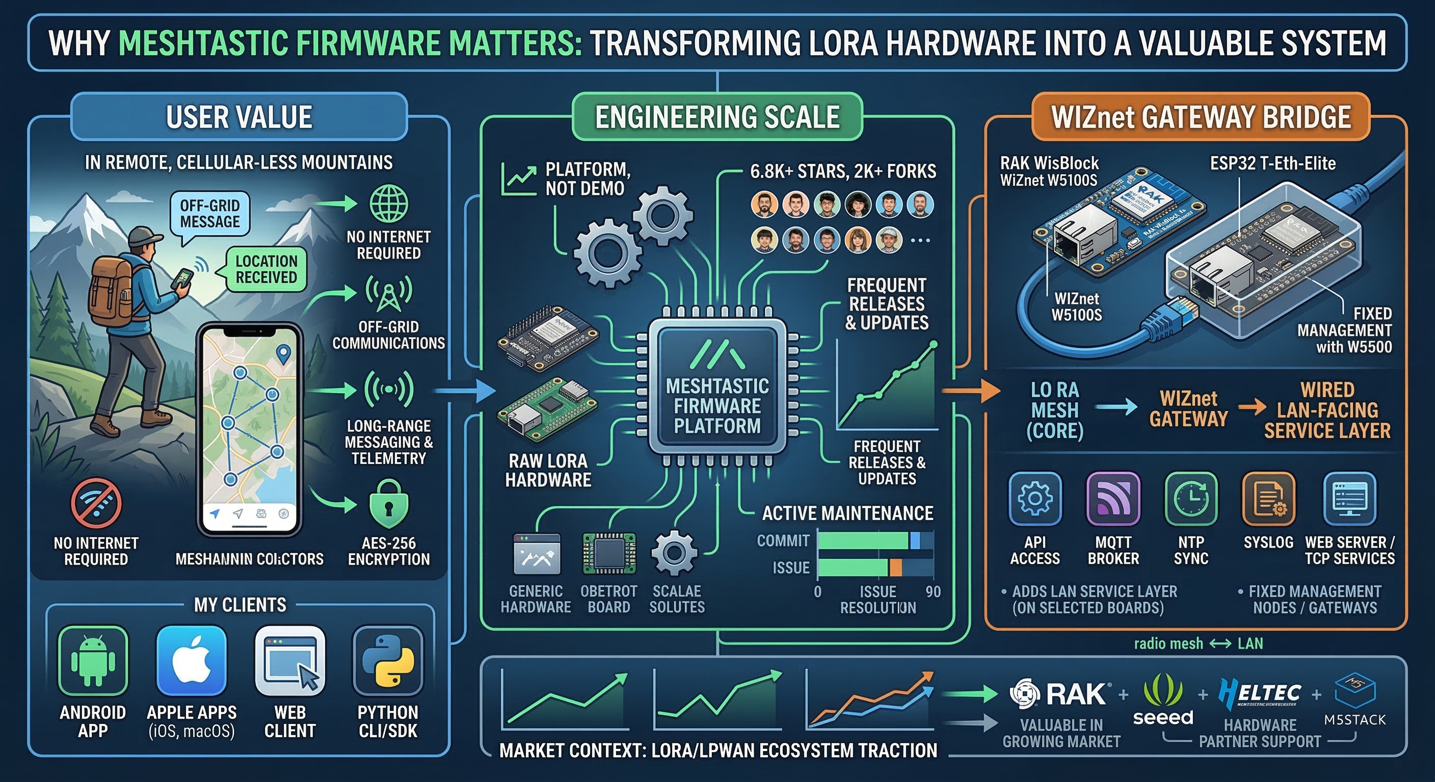 From a WIZnet angle, the most credible market interpretation is this: selected Meshtastic nodes can evolve from handheld/off-grid radios into fixed LAN-visible gateways or management nodes. That does not redefine Meshtastic’s core radio value, but it does broaden where the firmware can be useful: base stations, indoor repeaters, lab networks, club infrastructure, shelters, field operations, or remote monitoring setups where a wired backhaul is preferable to Wi-Fi.