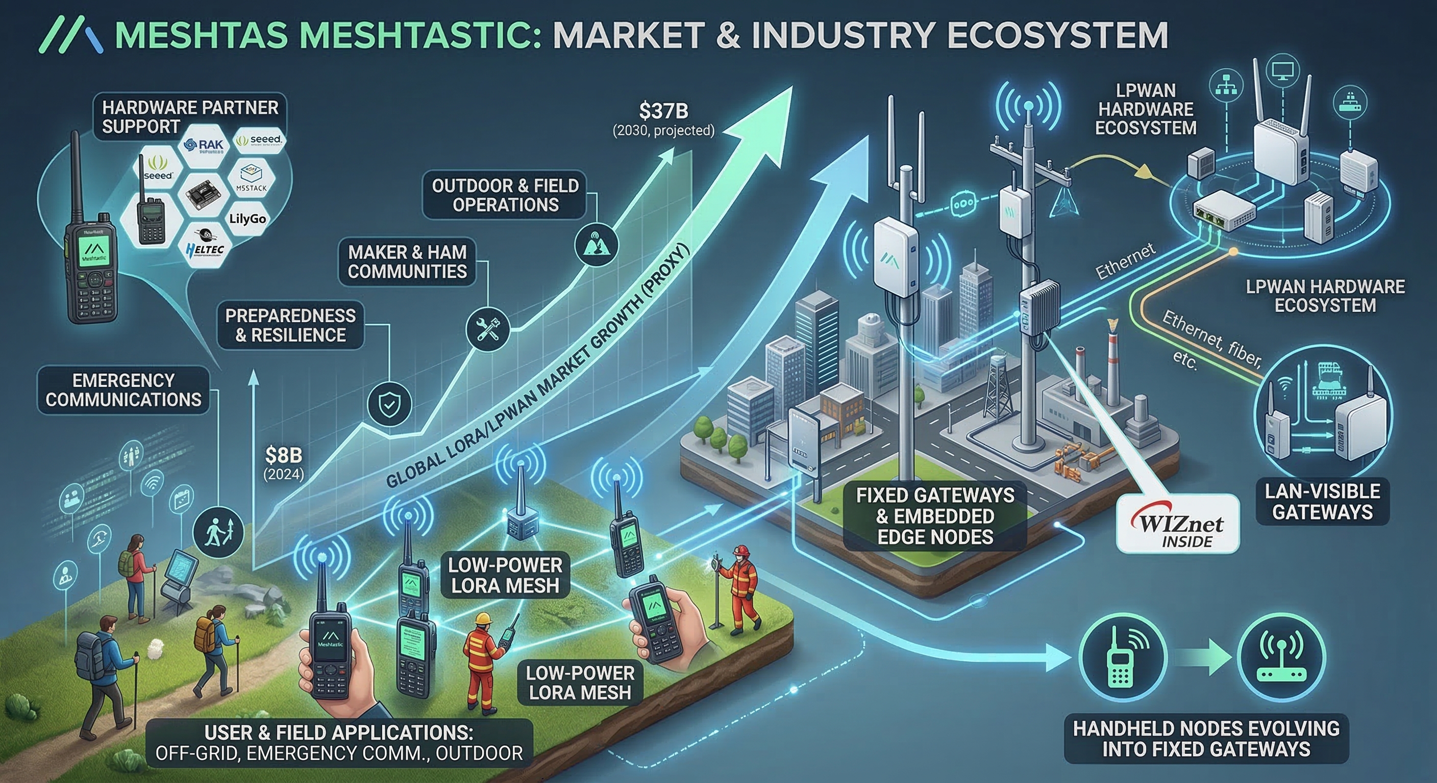 Finally, the broader commercial reference points around LoRa / LoRaWAN should be treated as adjacent market context, not as a literal Meshtastic revenue proxy. Meshtastic’s strongest commercial relevance comes from the hardware ecosystem, software ecosystem, and gateway potential visible today, rather than from a single clean market-size number.