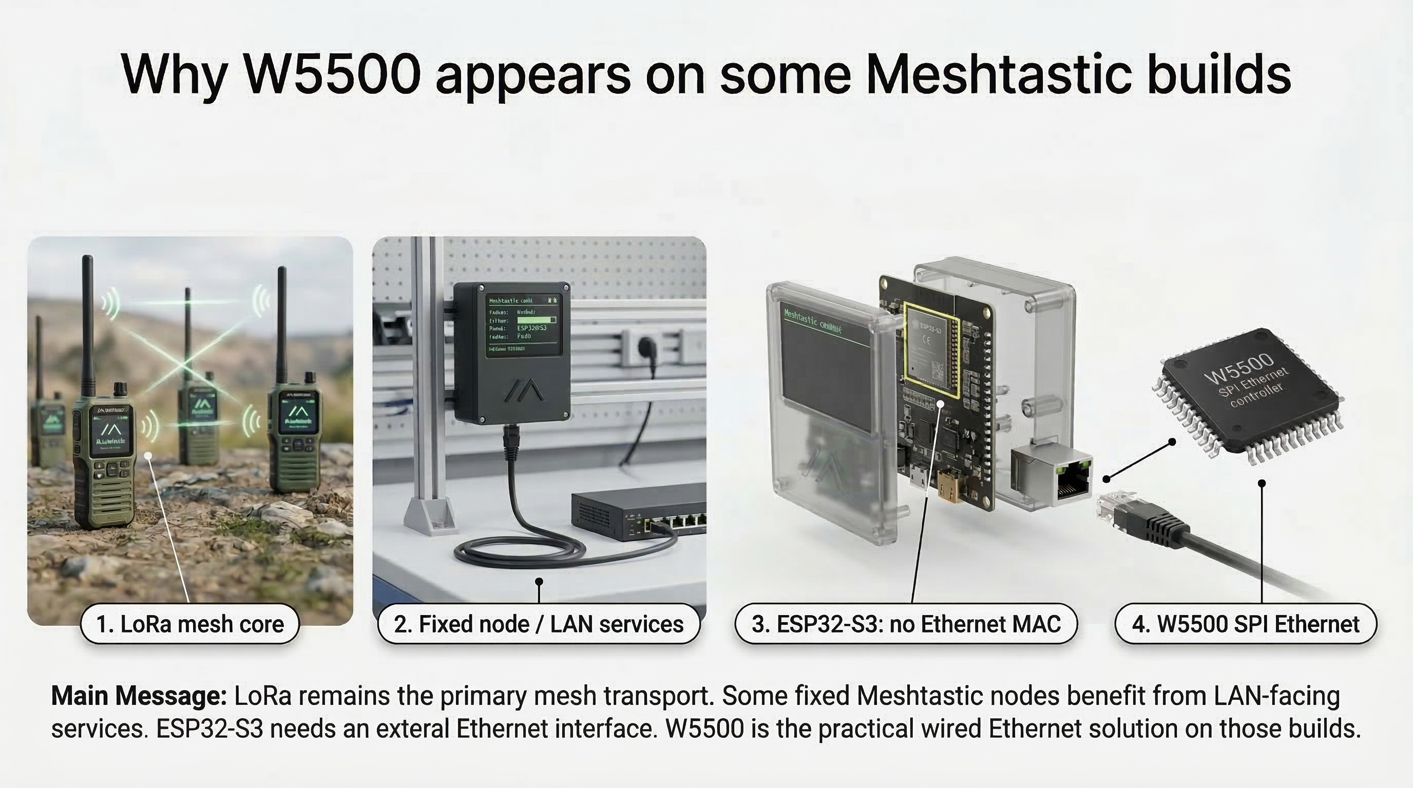W5500 appears in Meshtastic not because LoRa is insufficient, but because some Meshtastic nodes take on infrastructure roles, and on ESP32-S3 hardware the most practical wired-Ethernet path is the existing W5500-based board ecosystem. (meshtastic.org)