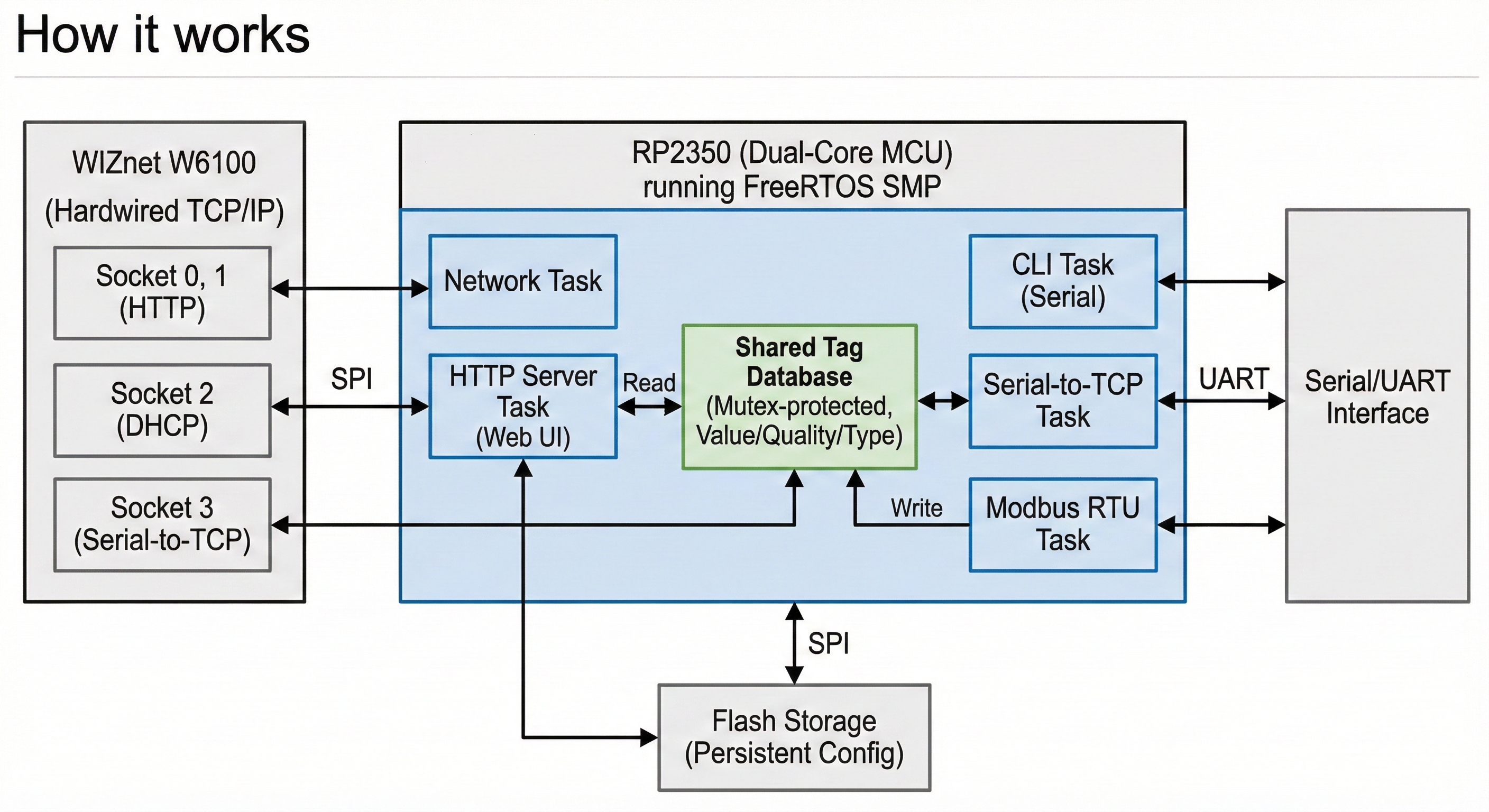 RP2350 + WIZnet W6100 IIoT gateway: FreeRTOS SMP with web UI/CLI, persistent config, serial-to-TCP and Modbus RTU→tag DB, Ethernet sockets for DHCP/HTTP.