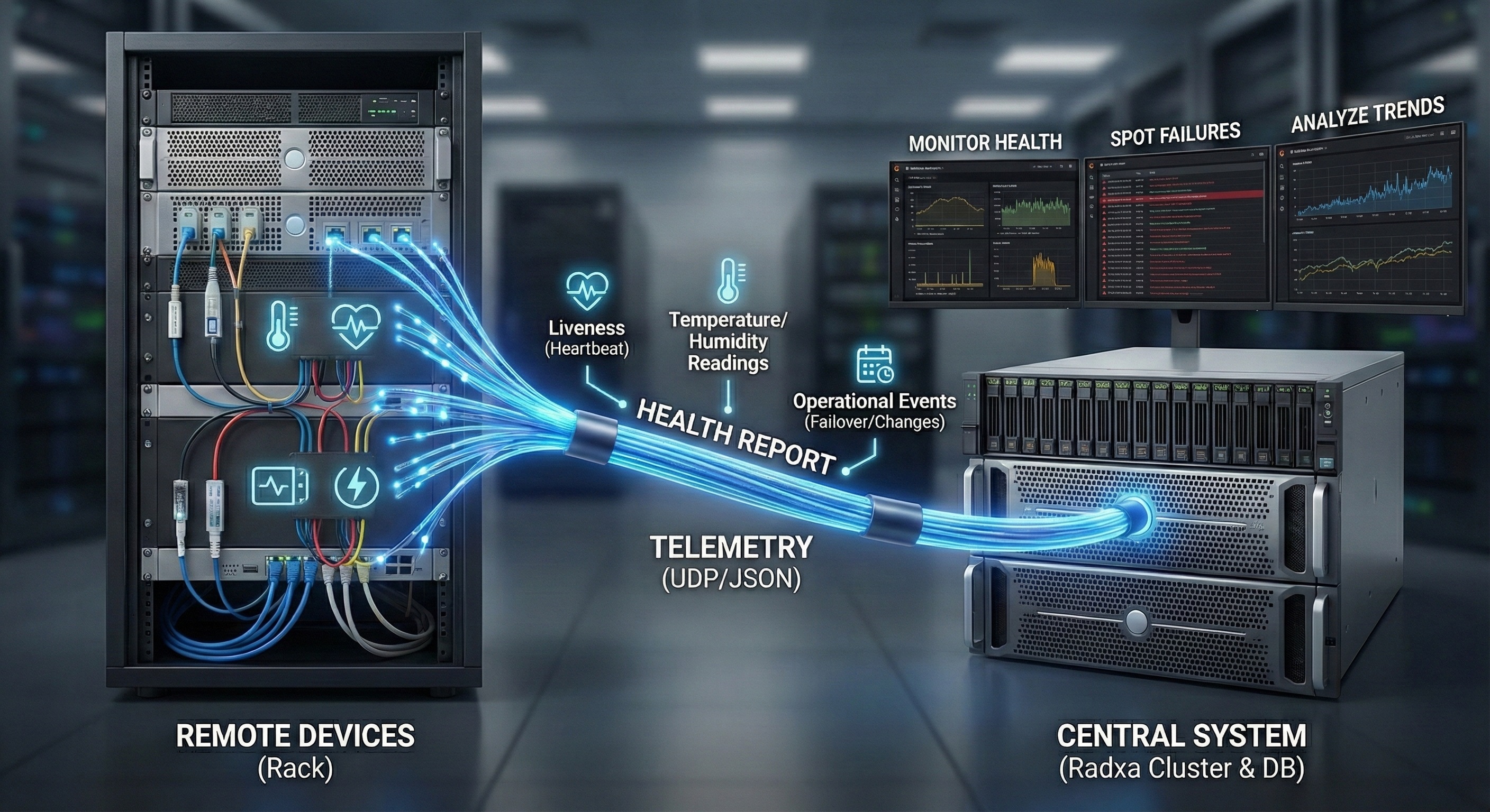 In this project’s context, telemetry is the rack’s “health report”: liveness (heartbeat), sensor readings (e.g., temperature/humidity), and operational events (failover/network changes). (GitHub)
