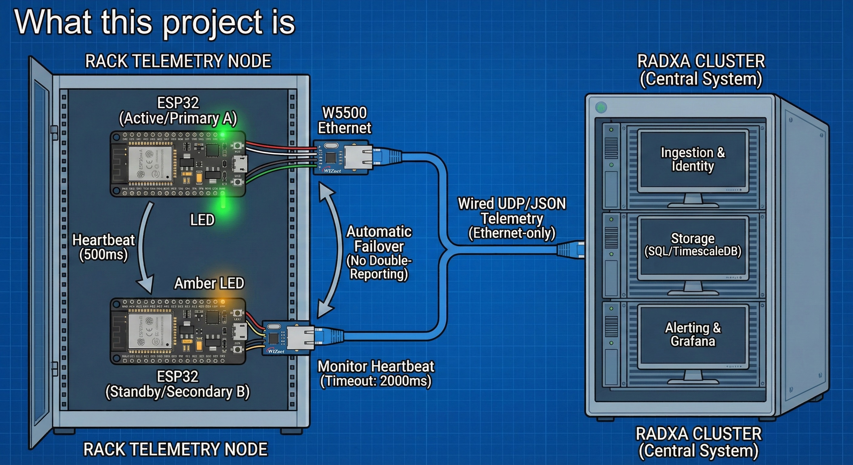 Dual-ESP32 rack telemetry node with heartbeat failover. Sends UDP/JSON over WIZnet W5500 Ethernet to a Radxa backend designed for PostgreSQL/Grafana.
