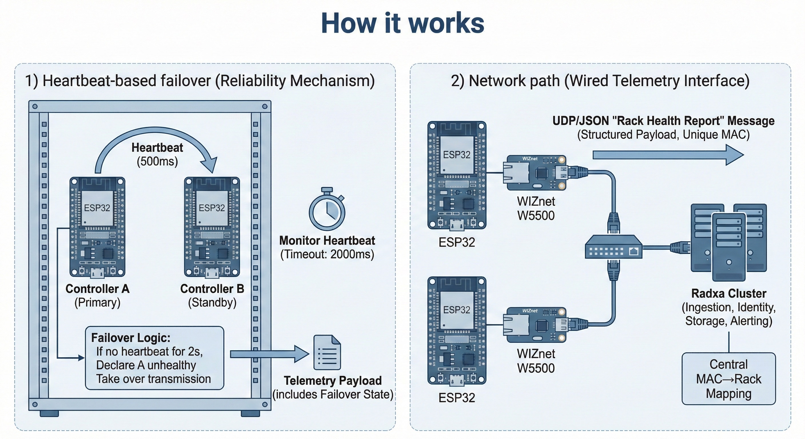 - High-availability rack telemetry pattern: two ESP32s per rack with automatic failover based on heartbeat timeouts. (GitHub)