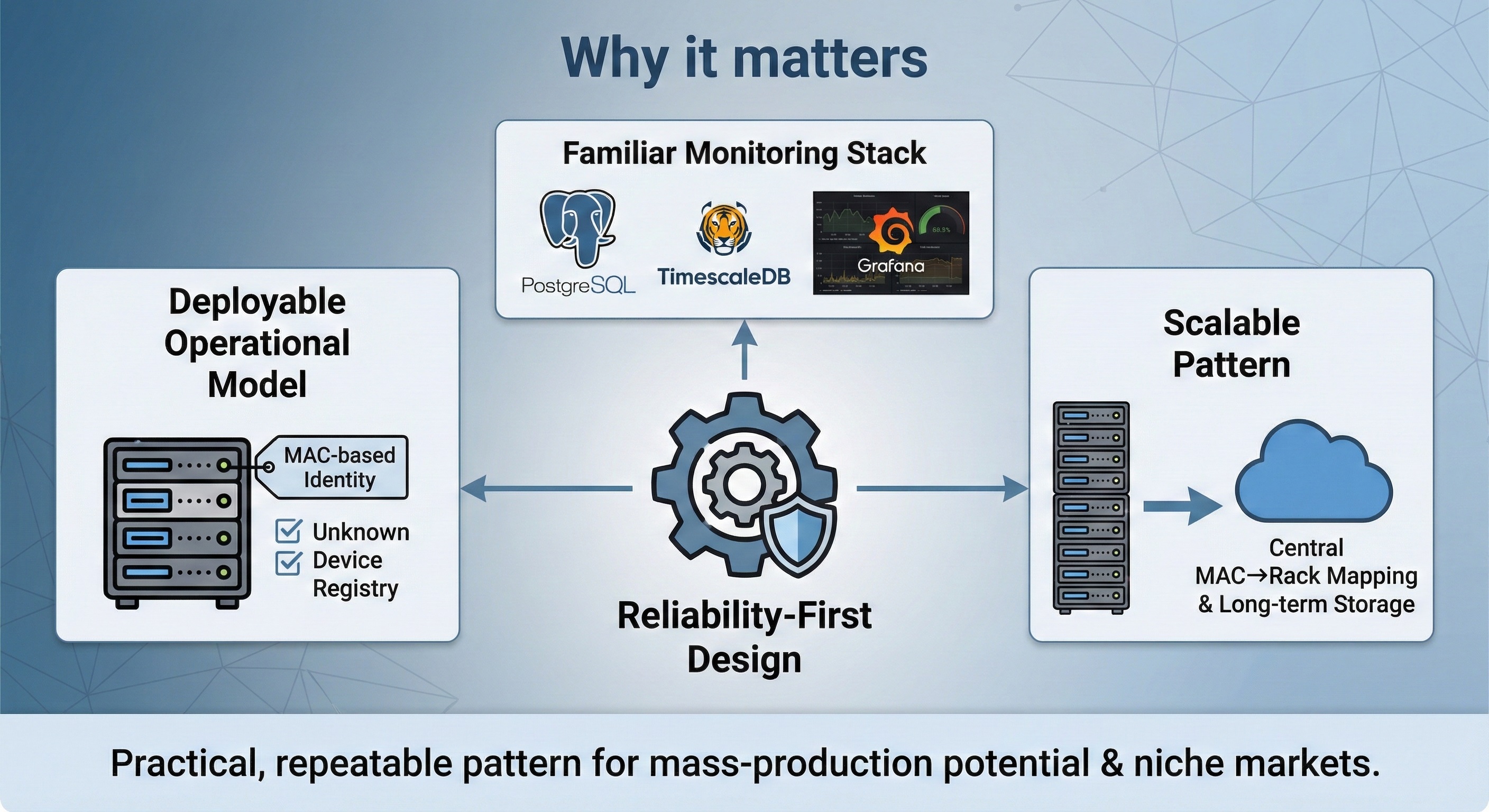 Reason: (mass-production potential) the “rack telemetry node” pattern scales cleanly with central MAC→rack mapping and long-term storage assumptions. (niche market) homelabs, edge clusters, and small rack deployments that value wired reliability and simple ingestion. (GitHub)