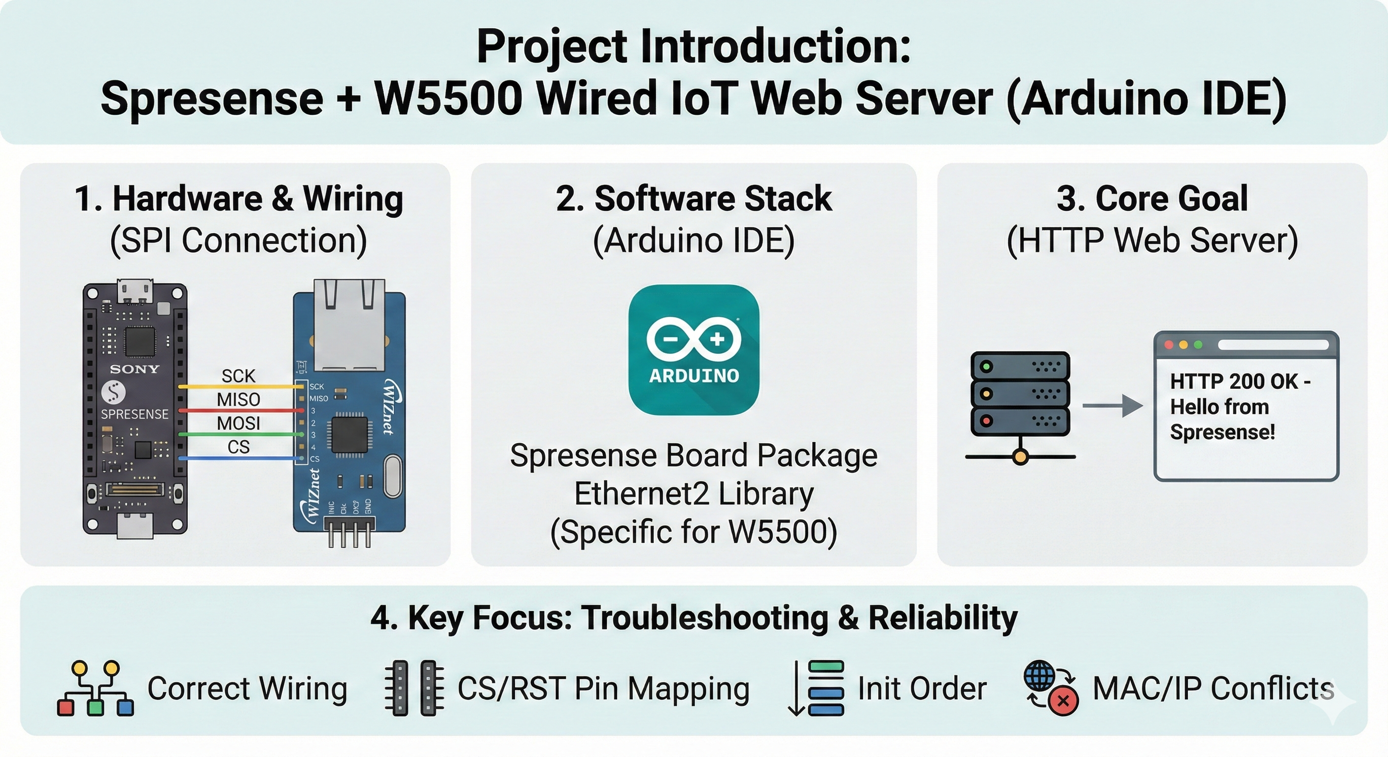 Spresense + WIZnet W5500 wired Ethernet web server tutorial: SPI wiring, Ethernet2 setup, CS/RST, init order, and troubleshooting for reliable bring-up.
