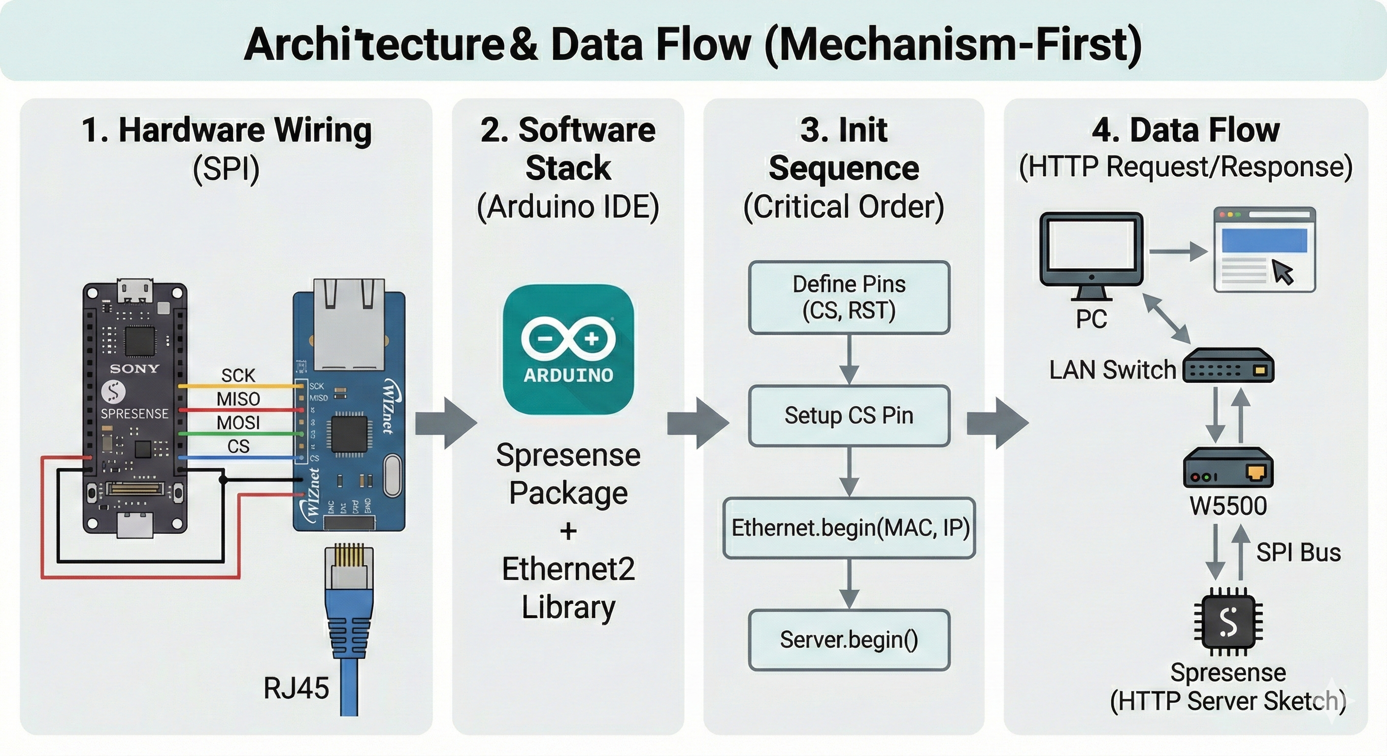 PC 브라우저 → LAN → W5500 → SPI → Spresense(HTTP 응답 생성) → 다시 역방향으로 응답이 돌아옵니다.