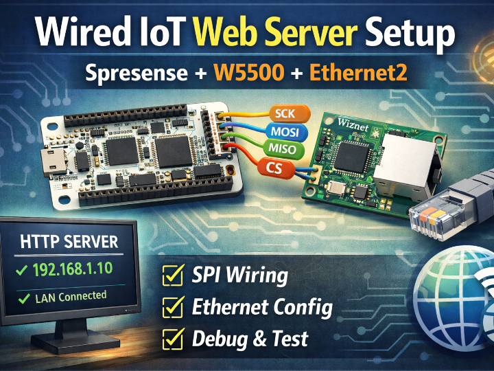 Spresense + WIZnet W5500 wired Ethernet web server tutorial: SPI wiring, Ethernet2 setup, CS/RST, init order, and troubleshooting for reliable bring-up.