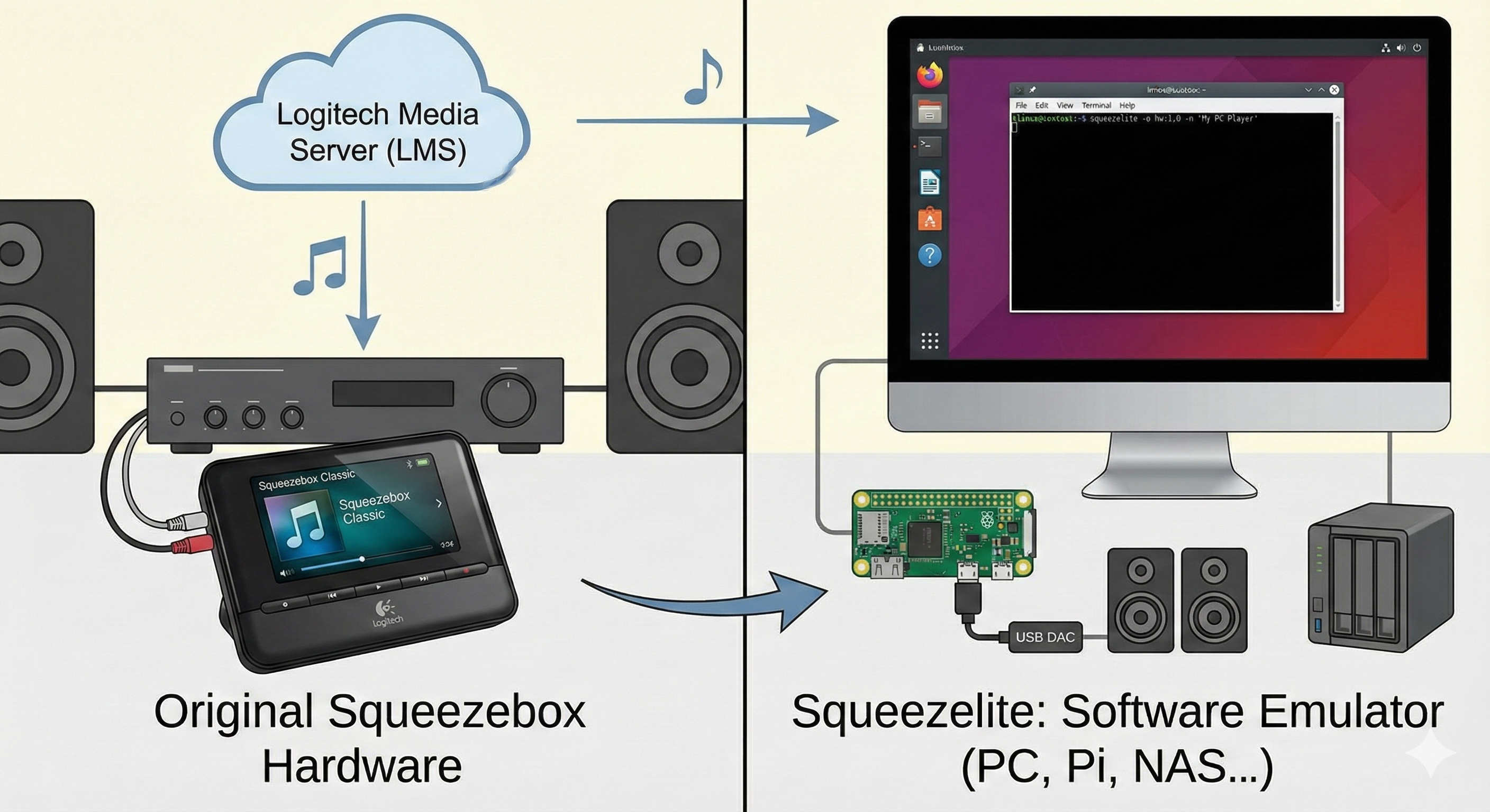 - On Linux/BSD/Windows, squeezelite is a small headless Squeezebox emulator – a software client for Lyrion (Logitech) Music Server.
