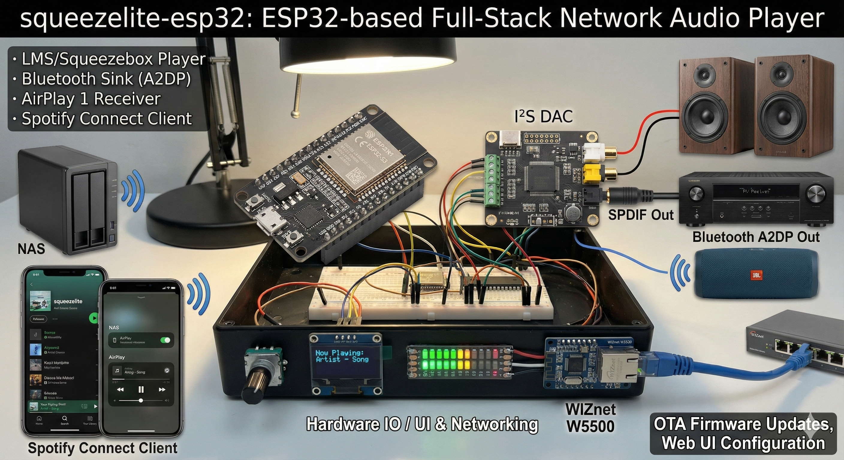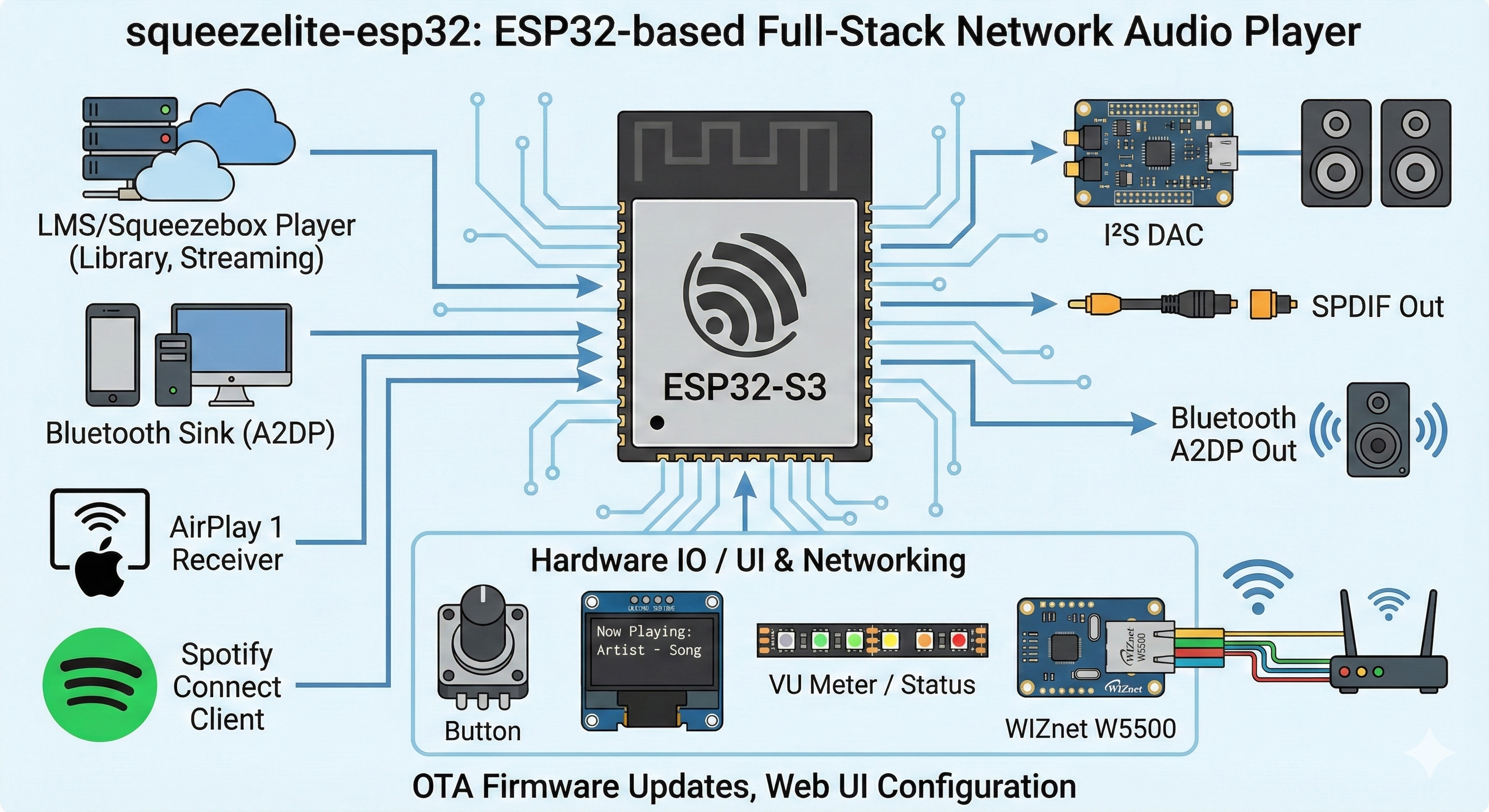 squeezelite-esp32 takes this small, headless software Squeezebox client and ports it onto ESP32 – then layers on Bluetooth, AirPlay, Spotify Connect, displays, buttons, and Ethernet (including W5500) to create an all-in-one embedded player.