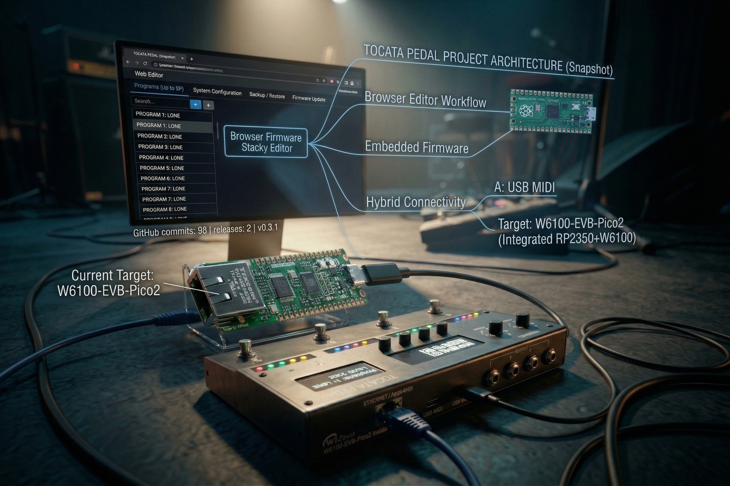 A useful nuance here is that the project should not be overstated as “a W6100-based pedal from the beginning.” The safer reading from the current source is that Tocata Pedal is the product concept, and W6100-EVB-Pico2 is the current Ethernet-capable hardware target in this snapshot. The source still contains a separate Raspberry Pi Pico branch, so the Ethernet board is better described as a significant current addition than the entire historical basis of the project.