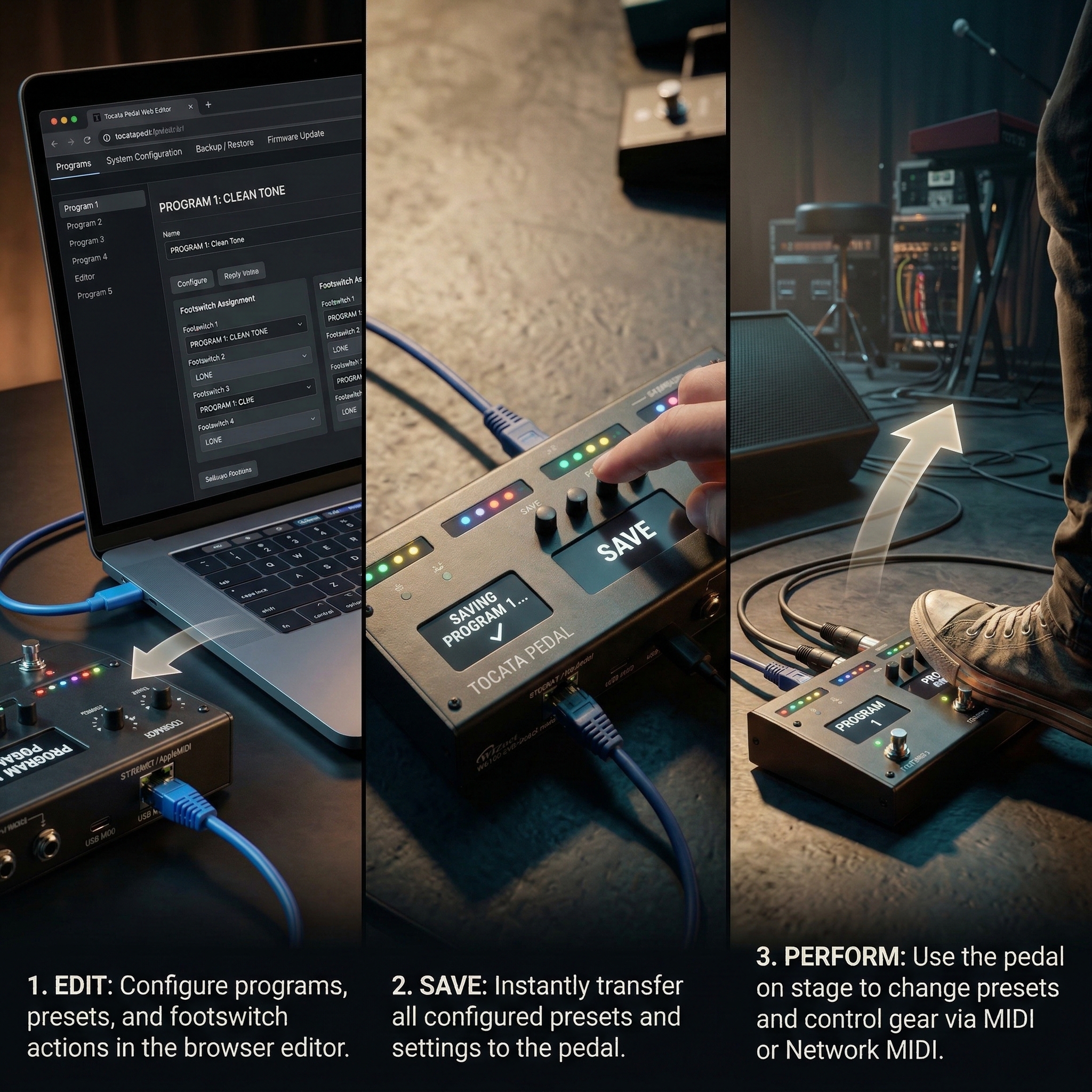 In human terms, the workflow is simple: edit on a computer, save to the pedal, step on switches during performance, and let the pedal tell the rest of the rig what to do.
