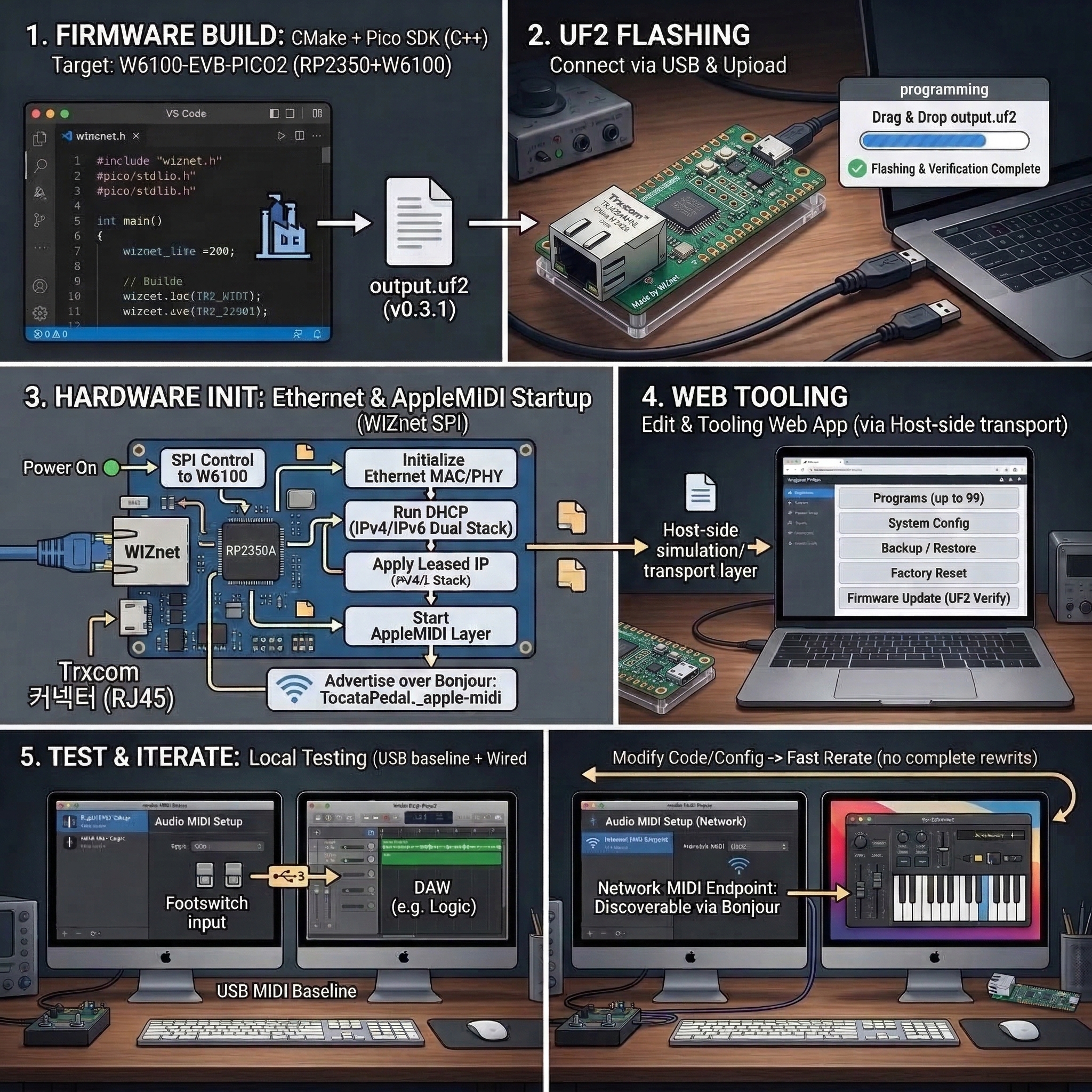 This FAQ covers the core features, workflow, and technical architecture of the Tocata Pedal, a programmable MIDI foot controller that features wired AppleMIDI over Ethernet using the WIZnet W6100-EVB-Pico2.