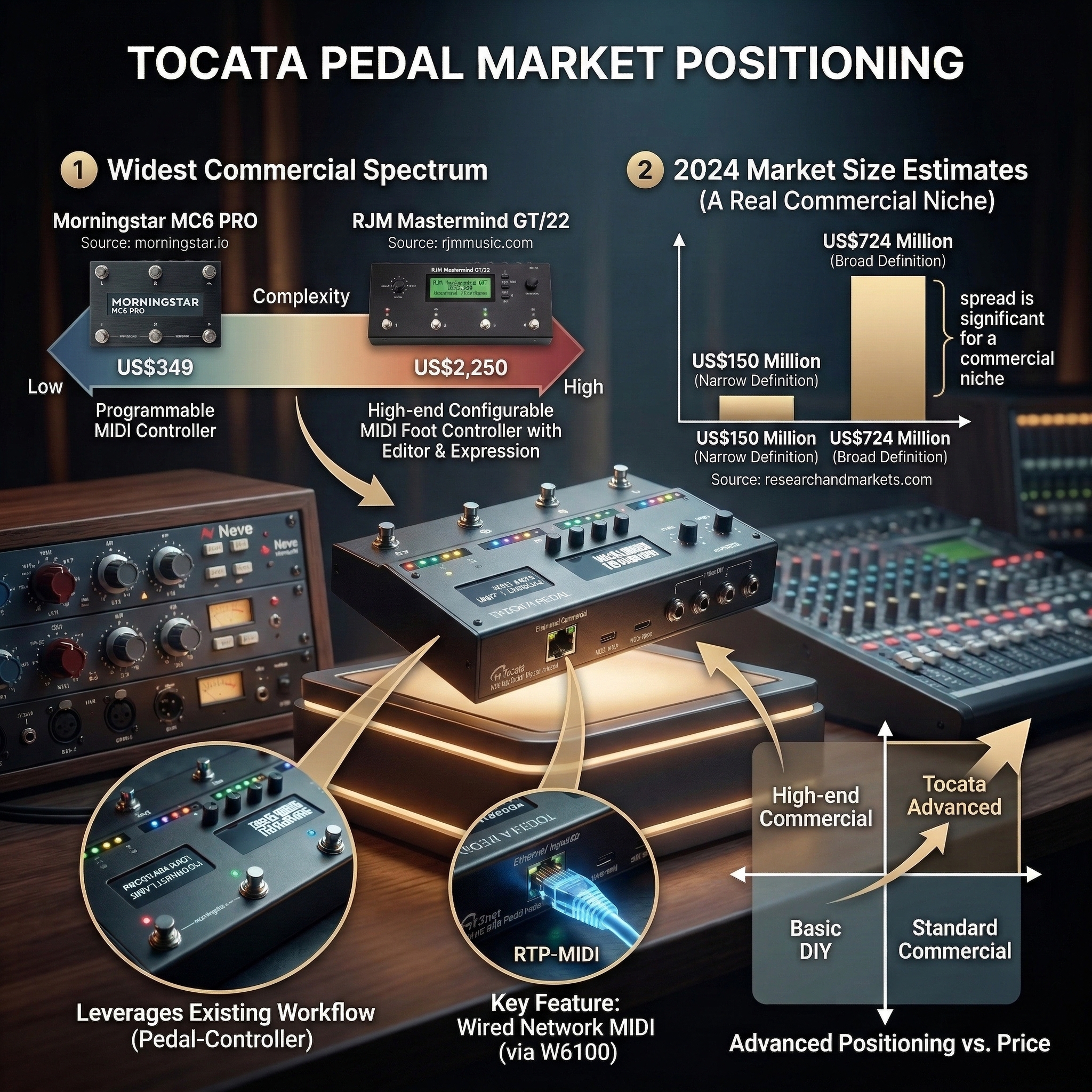 Public sizing for this exact market is not very clean. Different third-party reports estimate the 2024 MIDI foot controller market anywhere from about US$150 million to about US$724 million, depending on how narrowly the category is defined. That spread is too wide to treat as a precise number, but it is enough to say that this is a real commercial niche, not just a hobby curiosity. (researchandmarkets.com)