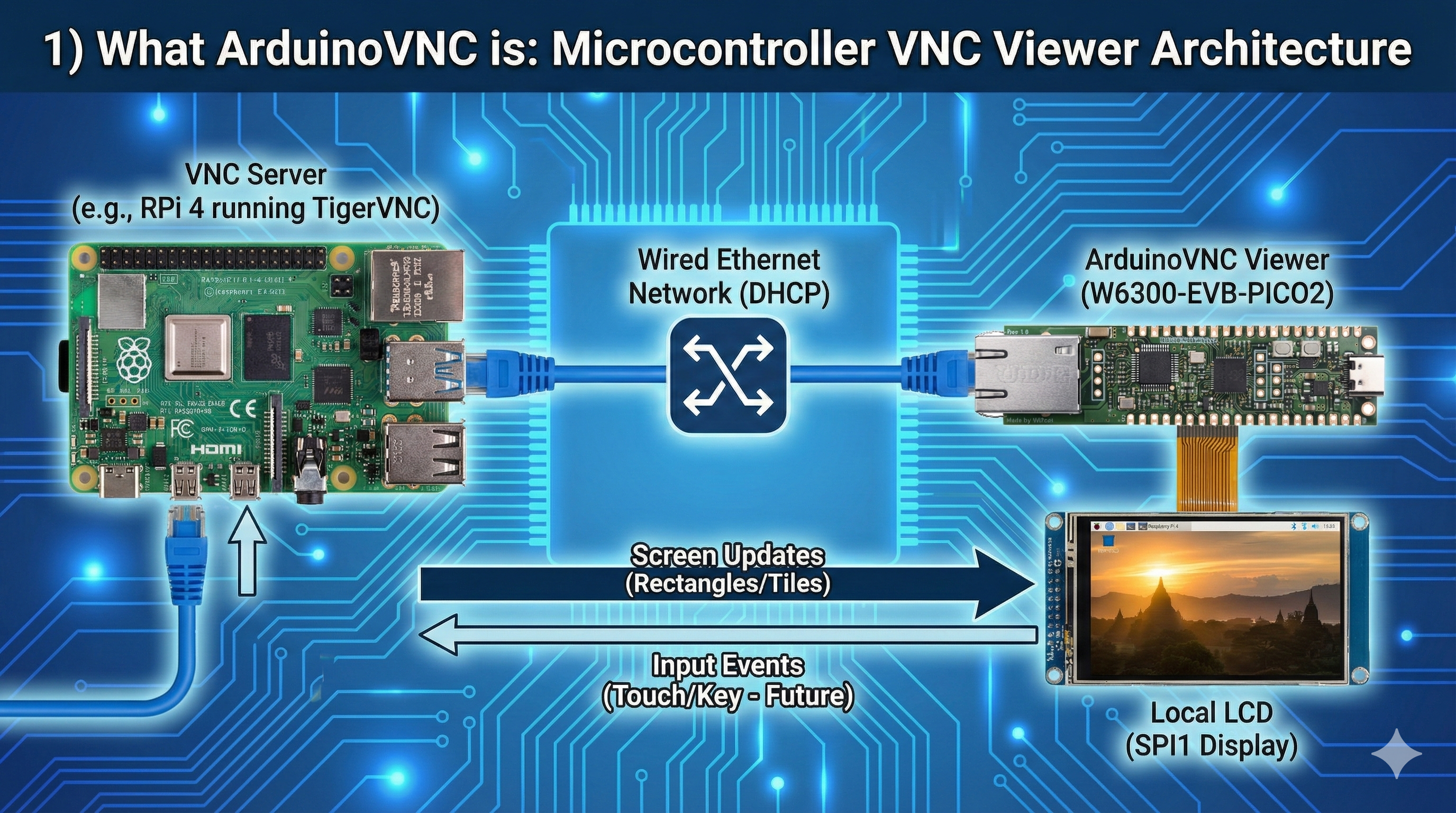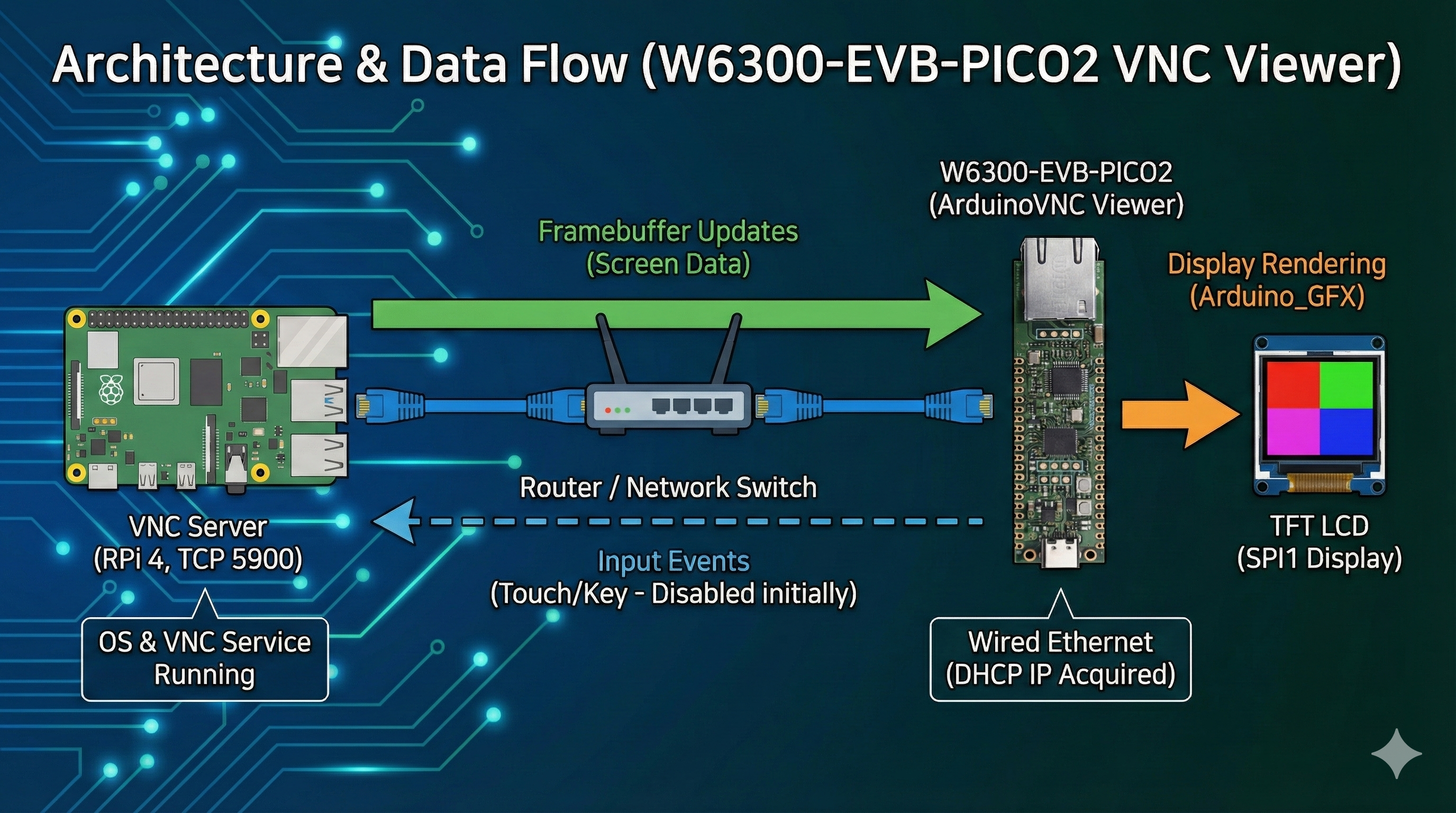 Porting ArduinoVNC to W6300-EVB-PICO2: replacing Wi-Fi with W6300 wired Ethernet (DHCP), avoiding SPI conflicts, and pushing toward a tiny thin-client