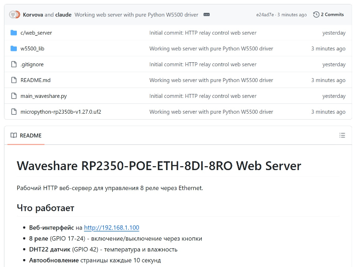 Waveshare RP2350-POE-ETH-8DI-8RO Web Server Рабочий HTTP веб-сервер для управления 8 реле через Ethernet. COMPONENTS PROJECT DESCRIPTION Documents Comments Write