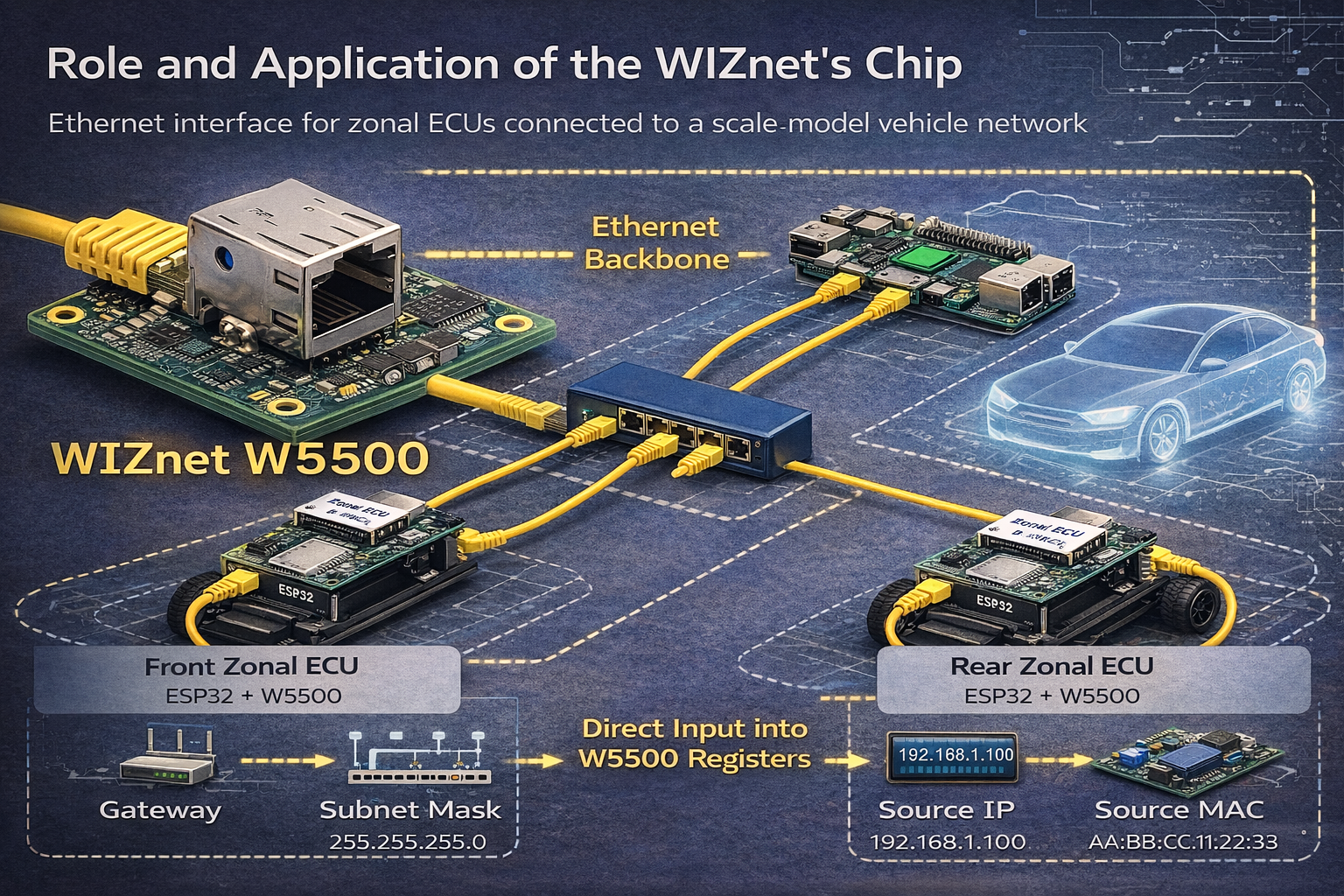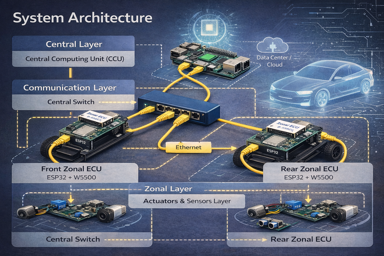 What makes this project stand out is that Ethernet is treated as the backbone of the architecture, not just as an extra interface. The public materials clearly position the system as a layered zonal network, where local ECUs are separated from centralized compute and linked through a switch-based communication fabric. In that context, the W5500 is not merely a connectivity chip — it is the hardware link that allows an ESP32-based zonal node to behave like a networked ECU.