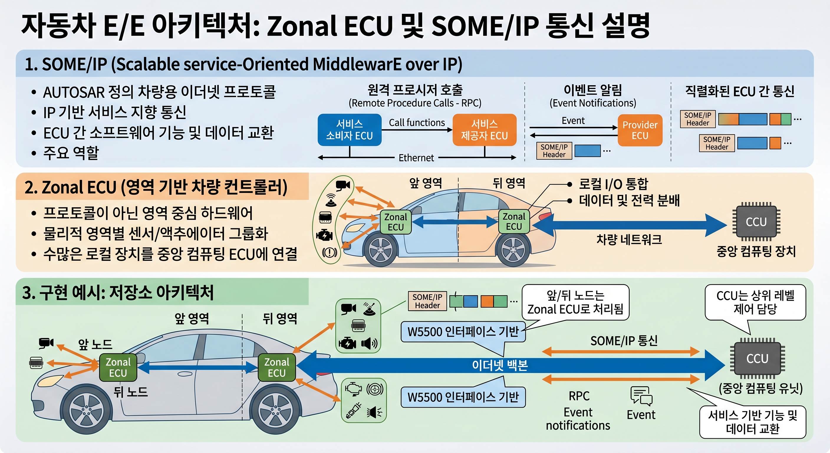ZonalArchECU_W_SomeIP is a scale-model zonal ECU project that explores how a vehicle-style zonal architecture can be implemented with front/rear ECUs, a central switch, and a CCU. The public code already shows real motor control, a structured FreeRTOS service model, and a substantial custom W5500 Ethernet subsystem.