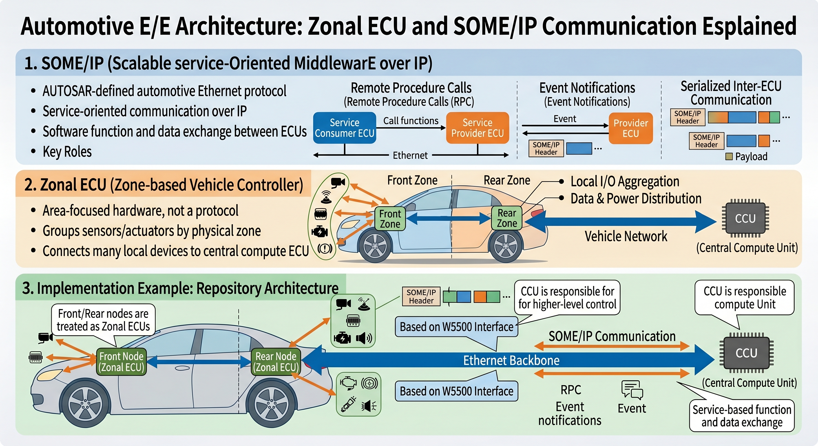 ZonalArchECU_W_SomeIP is a scale-model zonal ECU prototype that explores how a modern vehicle-style zonal architecture can be implemented on a small platform. According to the repository, the system is built around two zonal ECUs (front and rear), one central switch, and one central computing unit (CCU). The zonal ECUs are intended to handle local motor control and sensing, while the CCU is responsible for high-level behavior such as path planning.