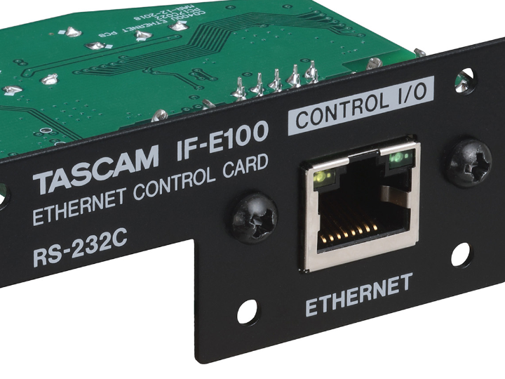 TASCAM’s IF-E100 is an Ethernet control expansion card that adds IP remote control to certain TASCAM installation media players. Once installed, the player can be controlled over a network using Telnet, which is a common “simple text command” interface used by AV/automation systems. (Tascam)