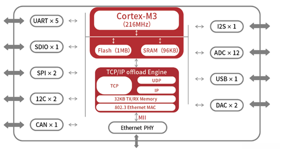 The W55MH32 adopts an advanced SoC architecture design, realizing the functions of multiple independent chips in traditional solutions within a single chip: