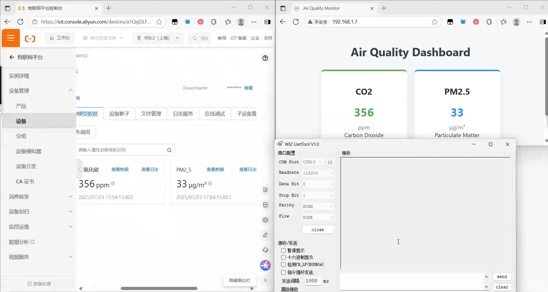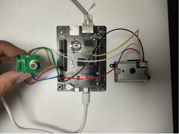 Based on this, I decided to embark on this project: This project, based on the W55MH32 Ethernet development board, utilizes the JW01-CO2 sensor (for real-time monitoring of carbon dioxide concentration) and the DC01 infrared PM2.5 sensor (for accurate detection of fine particulate matter in the air) to build an intelligent environmental monitoring solution. The system establishes a stable communication link with the Alibaba Cloud IoT platform via the MQTT protocol, enabling remote cloud-based transmission, storage, and analysis of monitoring data. Users can view historical data trends and alarm information in real time via mobile devices or the web.