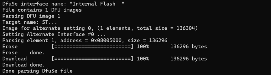 This command creates a DFU file that instructs the programmer to write firmware.bin starting at address 0x08005000.