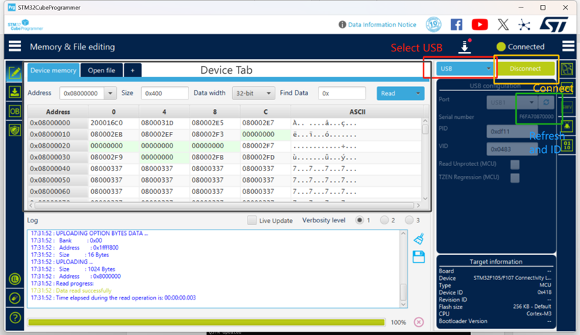 The firmware is programmed starting at 0x08005000, preserving the DFU bootloader in the first 20KB of flash.