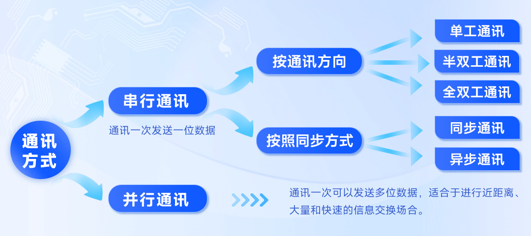 Parallel communication: Transmits data in bytes or multiples of bytes. It is fast but expensive over long distances. It is suitable for short-distance, high-volume, and rapid information exchange scenarios.