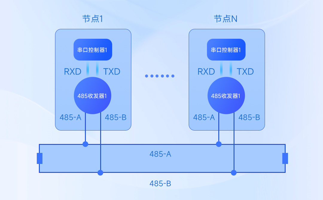The RS-485 standard overcomes the shortcomings of RS-232 communication, such as short communication distance and low data rate. It uses differential transmission for data signals, resulting in strong anti-interference capabilities. RS-485 uses a pair of twisted-pair cables (A and B lines) for data transmission. A voltage difference between lines A and B within the range of -6 to -2V represents "0", and a voltage difference within the range of +2 to +6V represents "1". Furthermore, RS-485 requires a matching resistor at the far end of the transmission cable; its resistance should be equal to the characteristic impedance of the transmission cable. A connection diagram is shown below.