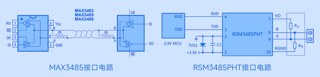 Typical non-isolated chips include MAX3485, ADI's MAX13487EESA+T, and TI's SN75176BDR; commonly used isolated chips include RSM3485PHT, TI's ISO3082DWR, and ISL32705E.