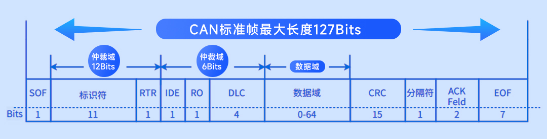 CAN bus communication uses differential signals for data transmission. The signal transmission lines are divided into CAN_H and CAN_L. A logic "0" on the bus indicates dominance, with a differential voltage difference of approximately 2V (CAN_H = 3.5V, CAN_L = 1.5V); a logic "1" indicates recession, with a differential voltage of 0V (CAN_H = 2.5V, CAN_L = 2.5V). CAN uses data frames for data transmission; the standard CAN data frame structure is shown in the figure below.