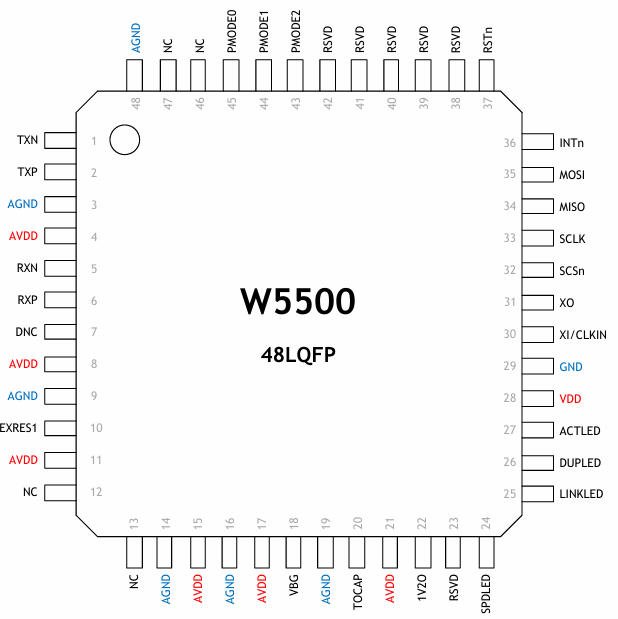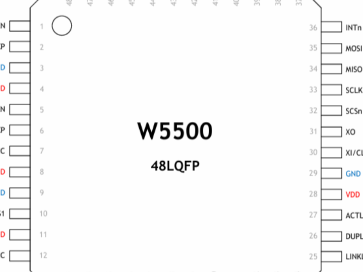 The following is a pin comparison diagram of the CH394Q and W5500 chips. The CH394Q and W5500 have the same package, and key pins such as the Ethernet port and crystal oscillator pin are fully compatible.