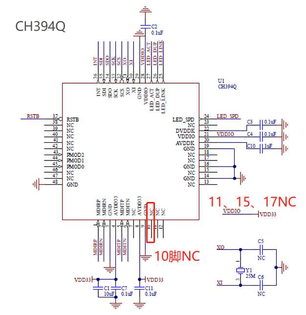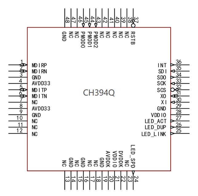 (4) The I/O pins of CH394 use VDDIO power supply. VDDIO supports 3.3V, 2.5V and 1.8V . An external 0.1uF capacitor to ground (in the range of 0.1uF to 1uF) is connected and placed close to the chip, allowing VDDIO to be directly connected to VCC33.