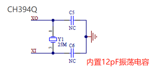- The CH394Q crystal oscillator has a built-in 12pF oscillation capacitor . If there is a resistor or capacitance to ground on pins 30 (XI) and 31 (XO), remove the resistor. The capacitor must be removed when the crystal load capacitance is 12pF (it is already built-in), and 15pF is recommended when the crystal load capacitance is 20pF.