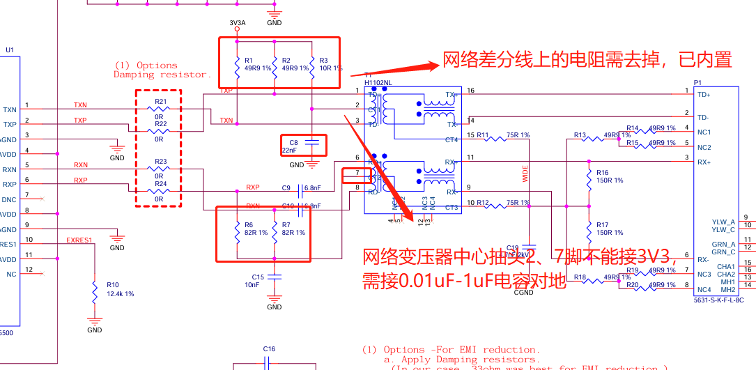 - Shorting the two center taps and sharing a capacitor is a secondary option. If it is not possible to disconnect the center taps from the power supply, then the resistor connected in series on the Ethernet drive signal line should be replaced with a 10nF DC blocking capacitor, which can be selected from 4.7nF to 0.1uF.