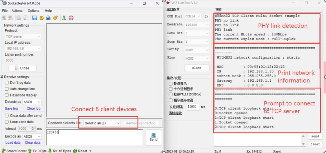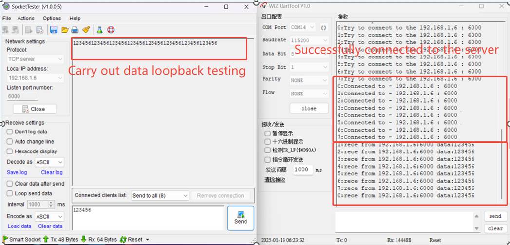 After executing the state machine, it will automatically switch to the next socket, enabling the simultaneous opening of 8 sockets for TCP Client mode data loopback testing.