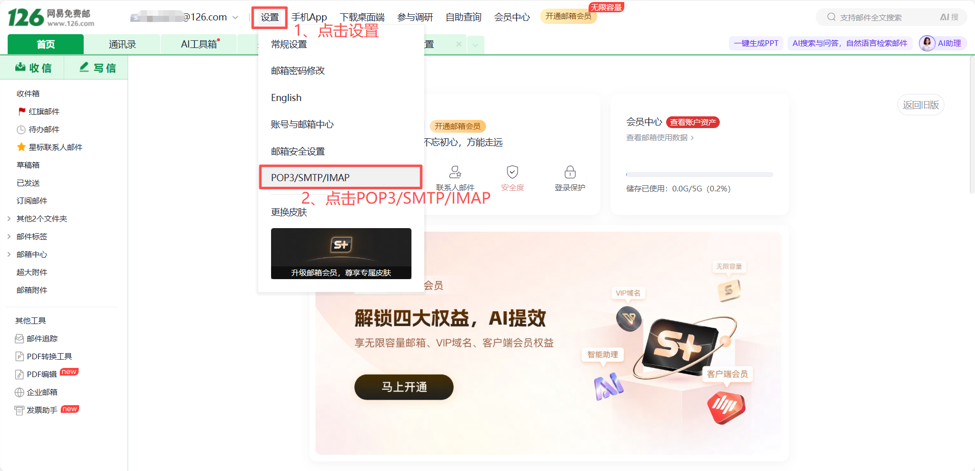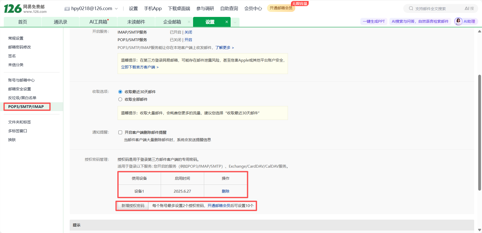 Due to NetEase restrictions, third-party email clients must use an authorization code to log in to NetEase mailboxes. Log in to mail.126.com (163 mailbox: mail.163.com) via a browser and click "Settings" >> "POP3/SMTP/IMAP".