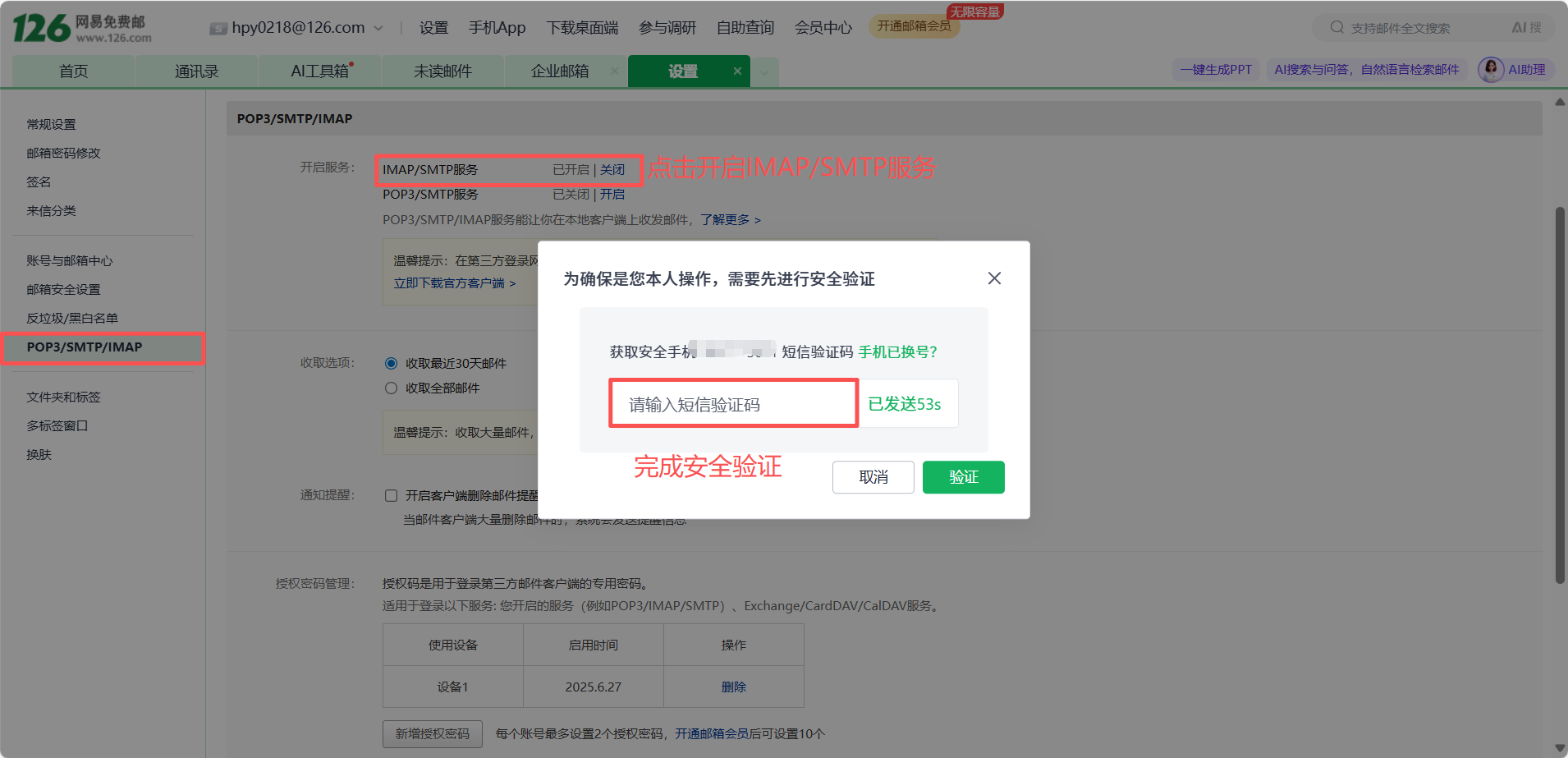 On the right web page, select "Enable" (IMAP/SMTP service), and the "Account Security Verification" page will pop up. Complete the verification yourself and obtain the client authorization password after verification.