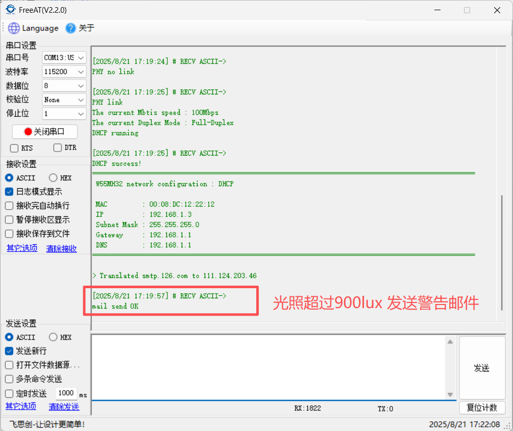 This project successfully implemented real-time light intensity monitoring and alarming using the W55MH32 via the SMTP protocol, validating the implementation of the Ethernet-based SMTP protocol. Thank you for your patience in reading! If you have any questions or would like to learn more about this product and its applications, please feel free to leave a message via private message or in the comments section. We will respond as soon as possible and provide more detailed answers and assistance!