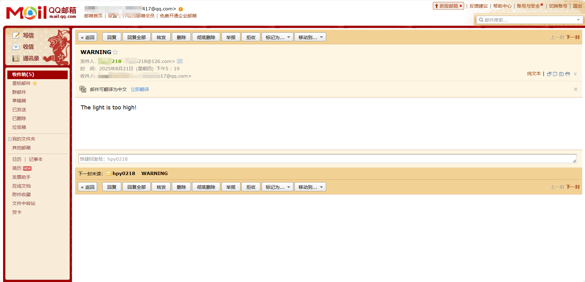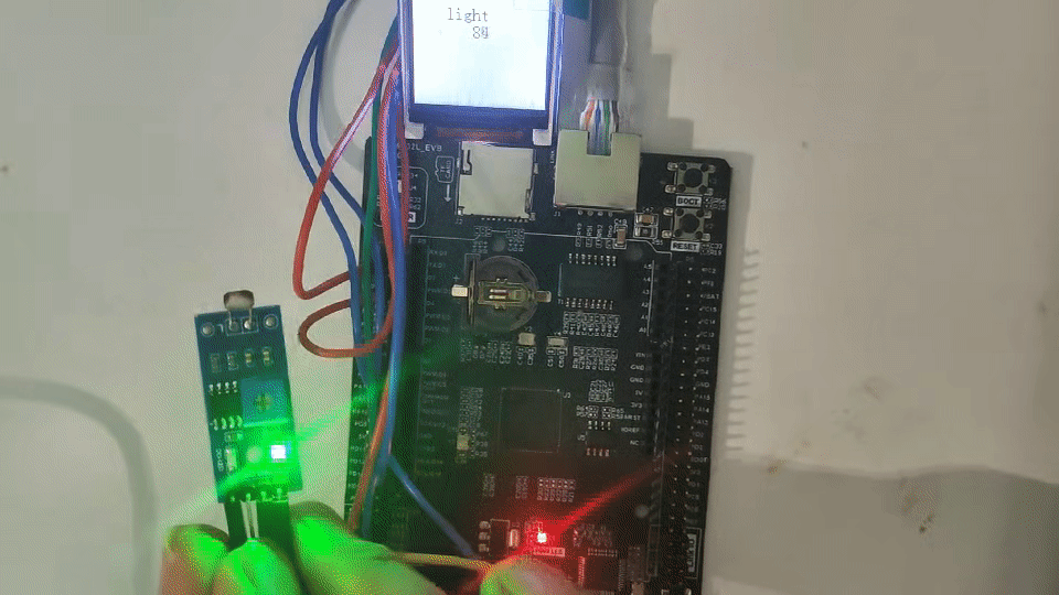 After successful power-on initialization, when the light intensity is detected, the light value is obtained through analysis and displayed on the TFT screen in real time. When the light intensity exceeds 900, a warning email of excessive light intensity will be sent to the designated receiving mailbox.