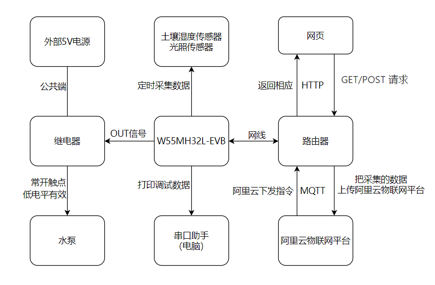 This repository provides a complete set of source code for a smart agriculture monitoring system based on the W55MH32 Ethernet microcontroller, implementing three core functions: collecting soil moisture and light data via ADC, and automatically controlling irrigation pumps based on thresholds; connecting to Alibaba Cloud via the MQTT protocol for remote data viewing and device control; and providing a local web interface for real-time monitoring and threshold adjustment.