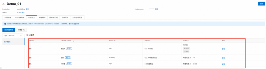 Create a product and add object models: Log in to the Alibaba Cloud IoT platform, create a product, and add the following object model functions to the product.