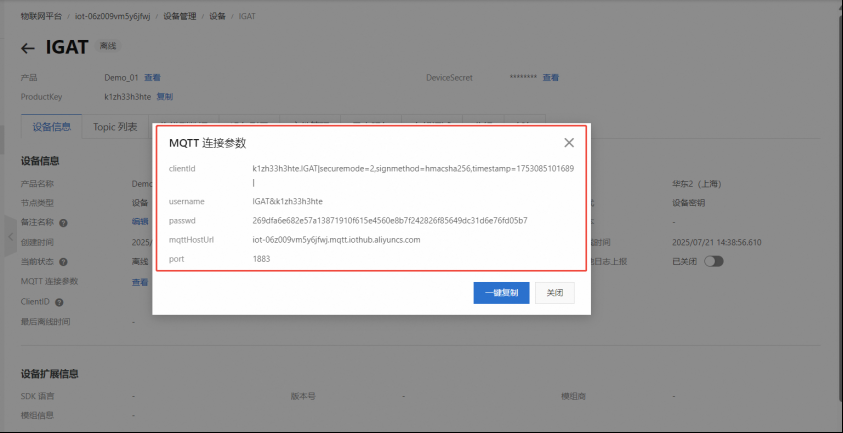 Connection parameters: Find the MQTT connection parameters in the device details page you just created.
