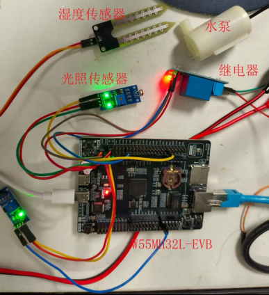Main controller: W55MH32L-EVB (216MHz clock speed, built-in hardware TCP/IP engine).- Sensors: Soil moisture sensor (analog output), light sensor (analog output).