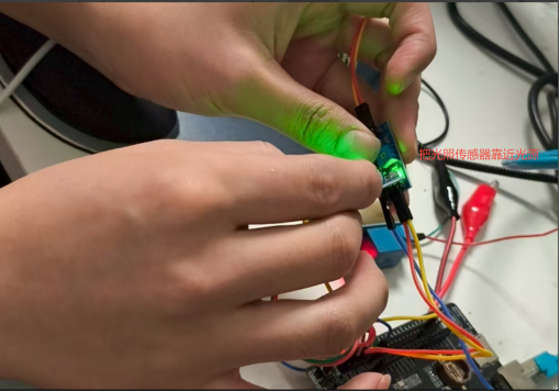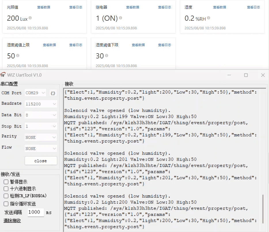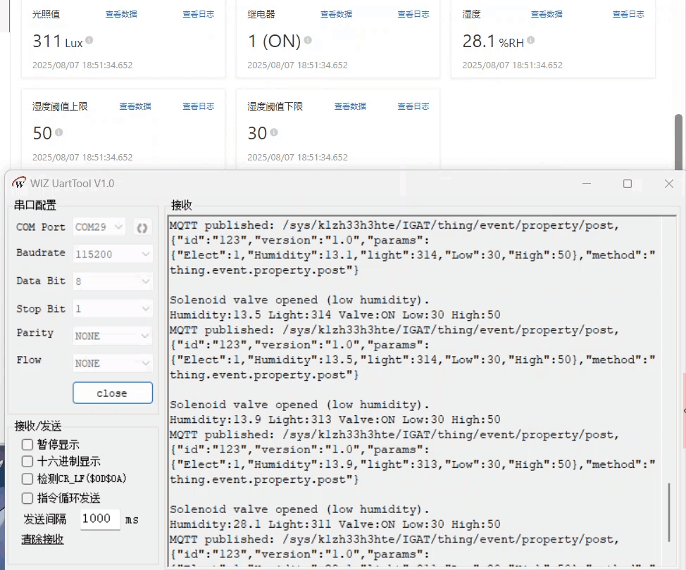 Data is collected every 5 seconds via the serial port and sent to the cloud platform. As we gradually move the light sensor closer to the light source, the light intensity increases. At this point, the soil moisture sensor, unplugged from the soil, detects air humidity below 30% RH. The relay opens, and irrigation begins.